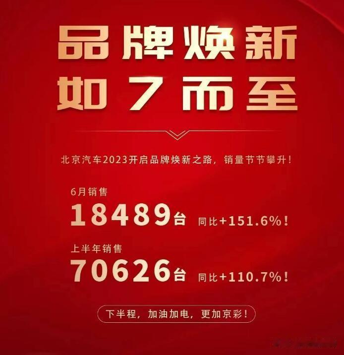18489辆!70626辆!北京汽车捷报频传!北京汽车在5月份就取得不错的成绩,6月份再接再厉,拿下了18489辆的好成绩,同比增长了151.6%;上半年的累计销量更是突破了7万辆大关,拿到了同比110.7%的高速增长,达到了70626辆的成绩!北京汽车焕新的品牌战略初见成效,也坚定了北京汽车回归主流品牌的信心!