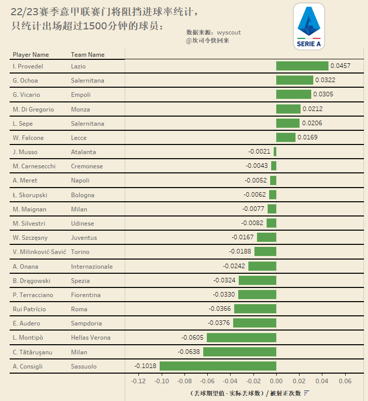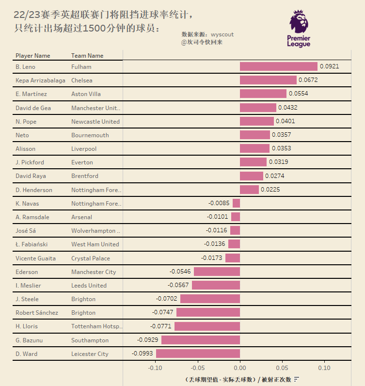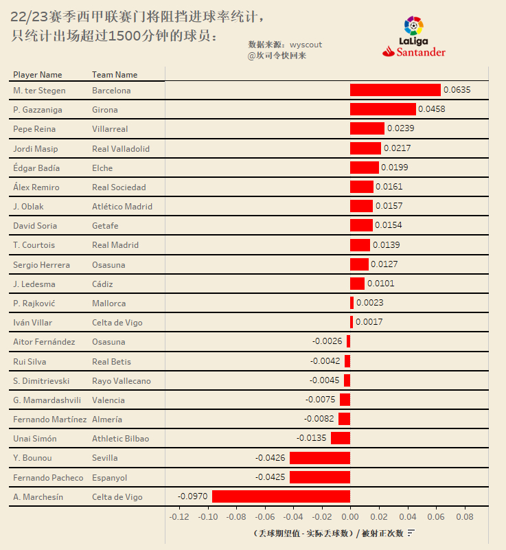 22/23赛季五大联赛门将阻挡进球率统计,只统计出场超过1500分钟的球员。