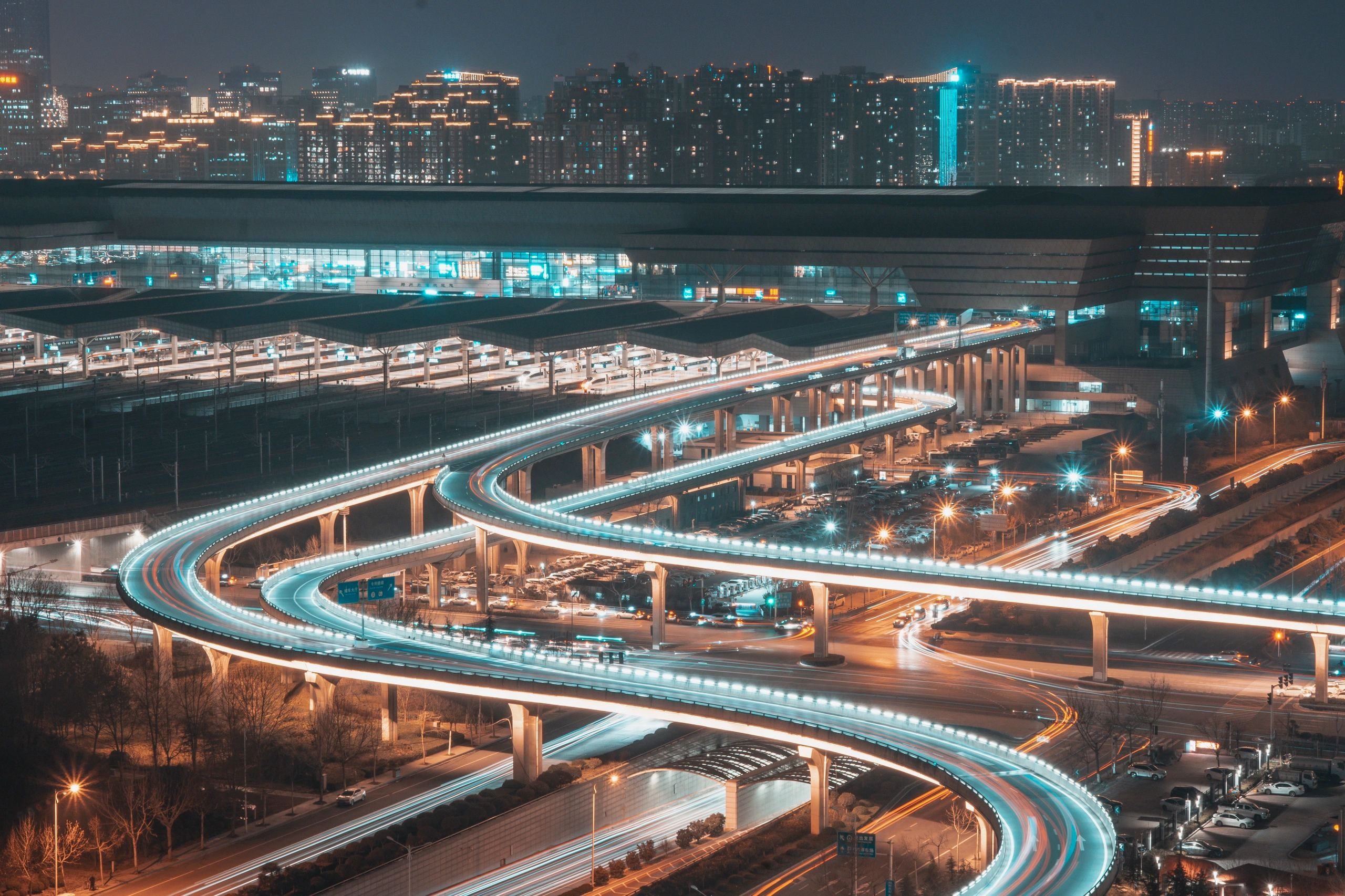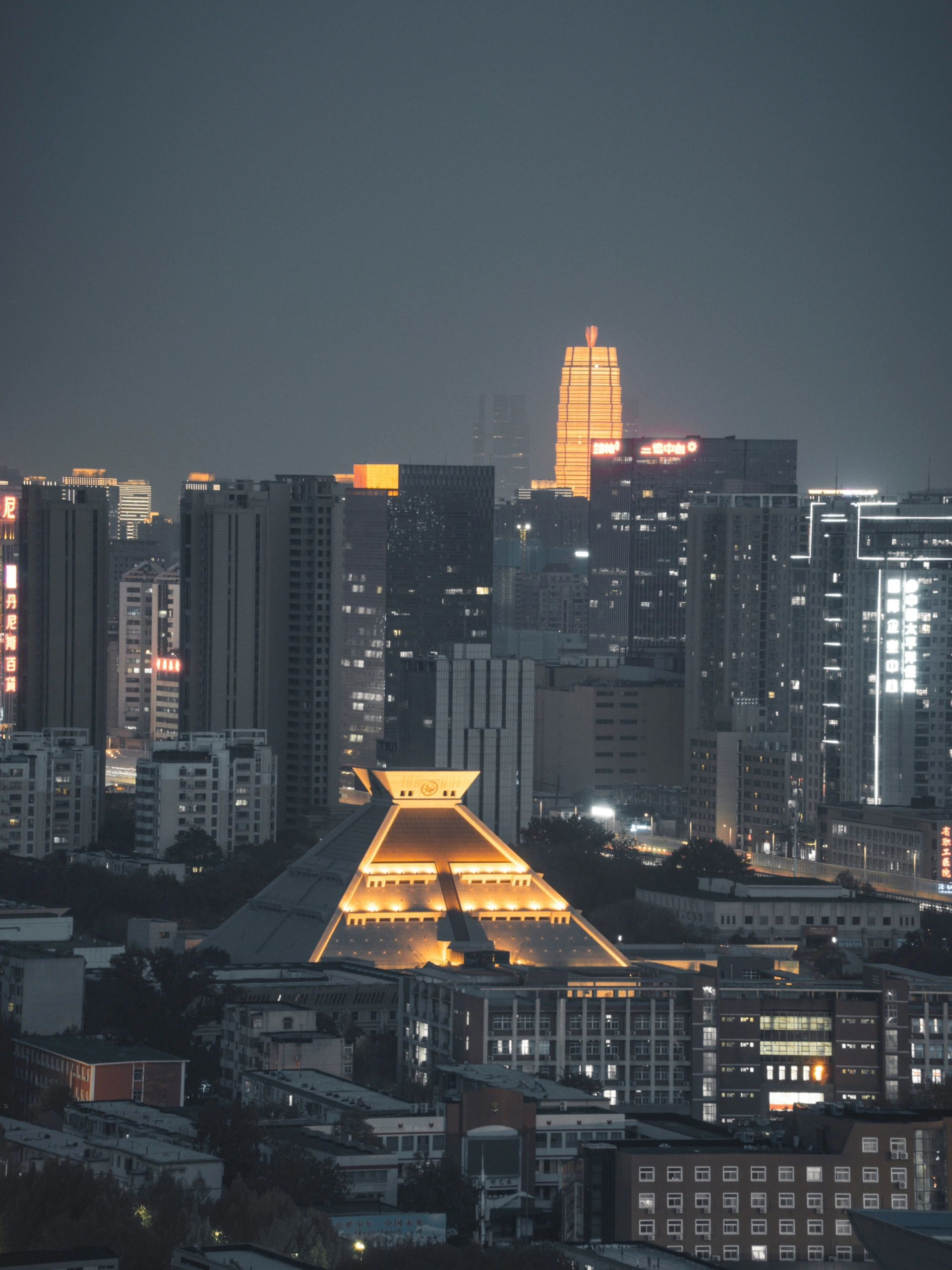 玉米楼在双子塔中间,同框+1,双子塔旁边就是郑州东站,顺便拍了一下高架桥和东站,晚上开了灯真的十分漂亮✨