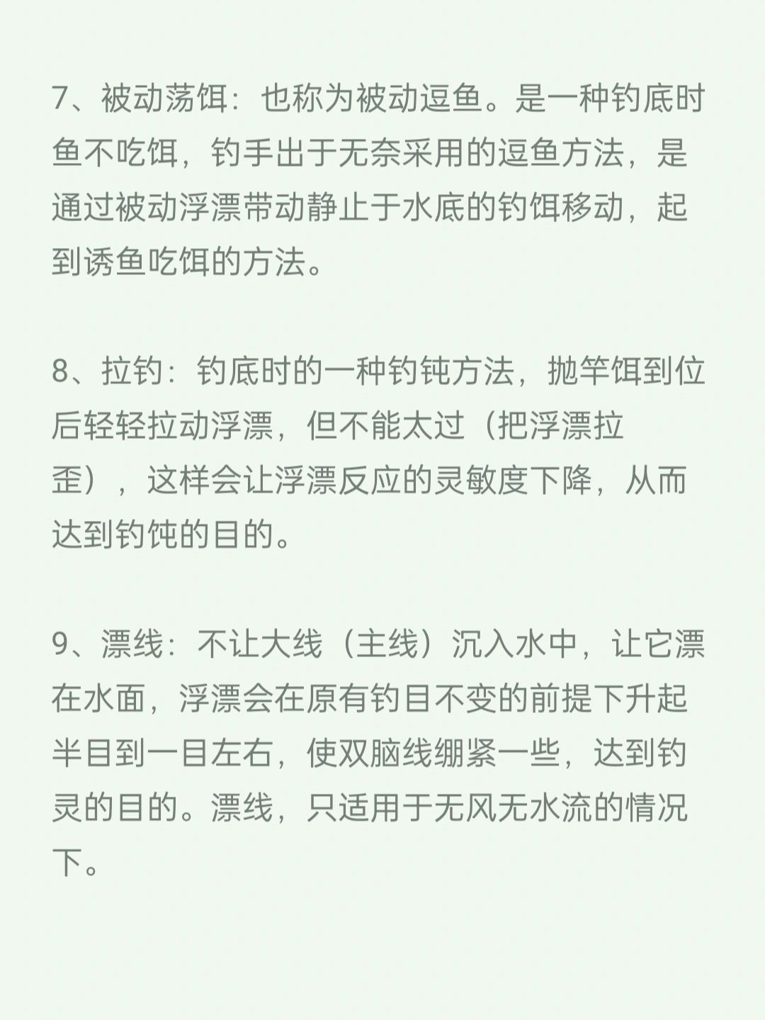 8、拉钓:钓底时的一种钓钝方法,抛竿饵到位后轻轻拉动浮漂,但不能太过(把浮漂拉歪),这样会让浮漂反应的灵敏度下降,从而达到钓饨的目的。