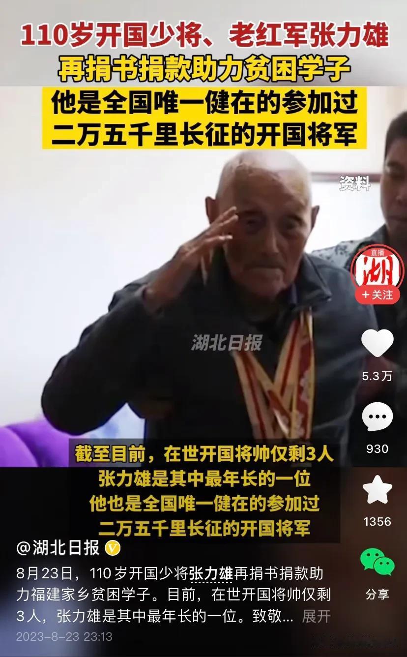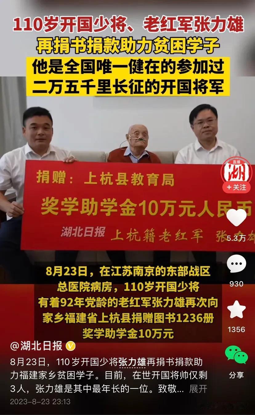 110岁的开国将军张力雄少将向家乡捐赠图书1236册和助学金10万元。他是唯一一位健在的参加过25000里长征的开国将军。 他1913年出生,18岁入党,19岁参加红军,红军时期曾随徐向前元帅参加西路军进入甘肃地区。抗战时期曾与皮定均中将一起开辟了豫北抗日根据地。解放战争时期曾分别跟随陈赓大将和粟裕大将参加伏牛山战役和淮海战役。他的一生充满了传奇与光荣,可谓是九死一生,波澜壮阔!