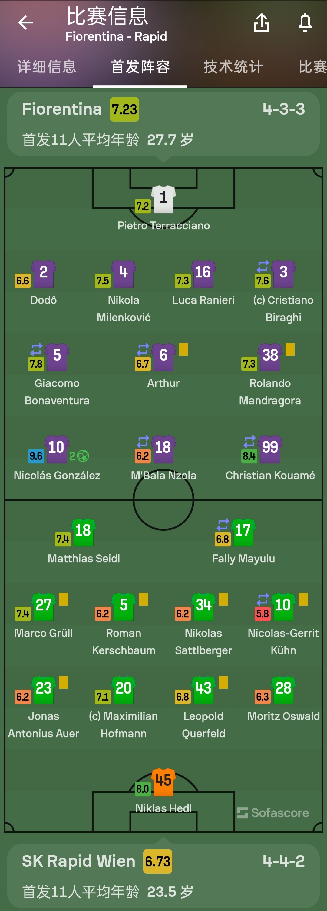 除了中锋和门将,昨晚首发的佛罗伦萨球员3天前刚跟维也纳快速踢了一场。(不要太飘了