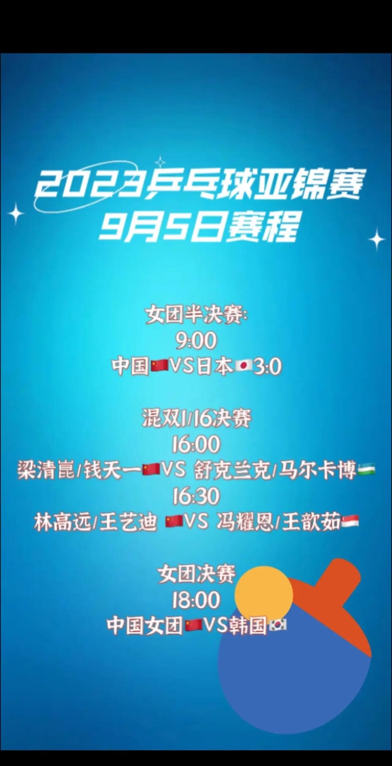 2023乒乓球亚锦赛决赛赛程 中韩大战即将上演值得期待 9月5日下午六点,亚锦赛女团决赛即将上演,中国女团对阵韩国女团,希望国乒女将好好发挥,能够顺利夺冠!!!🙏🙏