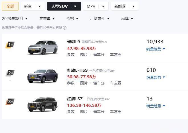 在只有3款车型的榜单当中,理想L9以10933辆拿到第一名!8月份的大型SUV领域,只有3款车型有销量数据,除了理想L9的10933辆之外,还有610辆的红旗E-HS9以及13辆的红旗LS7!理想汽车可以说是出尽了风头,旗下3款车型的月销量都超过了1万辆!#头号新车#