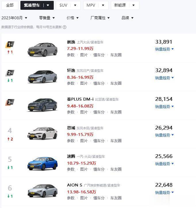 33891辆的大众朗逸,依然销量领先!在8月紧凑型轿车销量排行榜当中,超过3万辆的车型只有2款,分别是32894辆的日产轩逸以及33891辆的大众朗逸;比亚迪秦PLUS DM-i没有破3万辆门槛,只以28154辆的成绩,排在第3名!#头号新车#