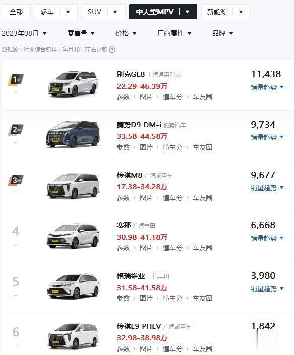 冠军是11438辆的别克GL8,腾势D9 DM-i以9734辆的成绩屈居亚军!在8月中大型MPV销量排行榜当中,月销量超过3000辆的车型有5款,但是只有别克GL8超过了1万辆;除此之外,还有9677辆的传祺M8、6668辆的广汽丰田赛那以及3980辆的丰田格瑞维亚!#头号新车#