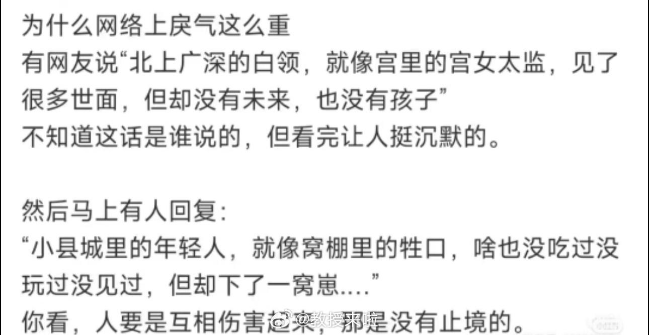 为了艾泽拉斯 17 2023-11-28 13:15 但是北上广的白领能吃啥好的,一顿饭上万,他们吃的起吗,能吃起的东西小县城也有,还便宜很多。优势就是孩子教育,但不生孩子有个屁优越感。 用户18xxx39 回复 11-29 02:22 打个比方吧。我在上海一年到手40+,不结婚不买房,任何一个周末我可以随时飞任何我想去的地方而且没有经济压力。你说所谓一顿饭上万可能哥们儿确实底层没吃过,但吃个千来块的东西我确实不算心疼。你在哪个小县城能支撑我过这样高消费的生活?我回家要是能挣30以上我明天就回,可是没那本事啊。 用户99xxx38 回复 12-02 15:27 白领平时吃的那种所谓省钱便宜餐比小县城的好菜还是好吃的,在县城在一线城市都住过,不一样