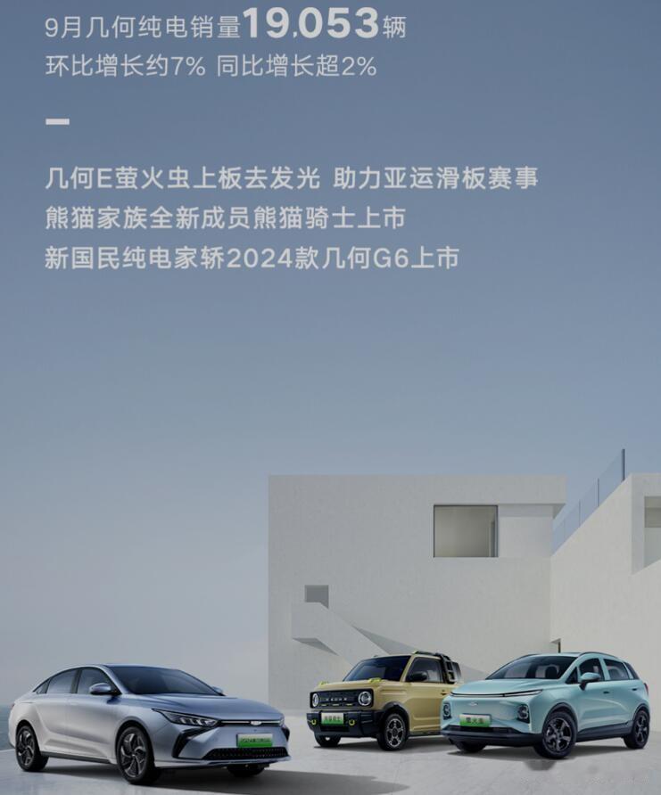 #秋日生活打卡季# 19053辆!几何纯电系列车型9月销量接近2万辆大关!保持了同比超2%、环比约7%的增长;9月份有熊猫骑士以及新款几何G6上市,为几何汽车的销量增长,贡献了绝对的流量;随着金九银十的深入,几何纯电系列车型的10月销量,必将超过2万辆门槛!