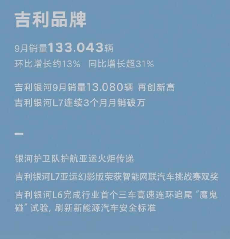 #秋日生活打卡季#133043辆!吉利品牌9月成绩单出炉!同比增长超31%、环比增长月13%;其中吉利银河9销量再创新高,达到了13080辆,银河L7连续破万,彰显了吉利品牌的产品爆发力!尤其是吉利银河L7押韵幻影版,荣获智能网联汽车挑战赛双奖、银河L6刷新了新能源汽车的安全标准!