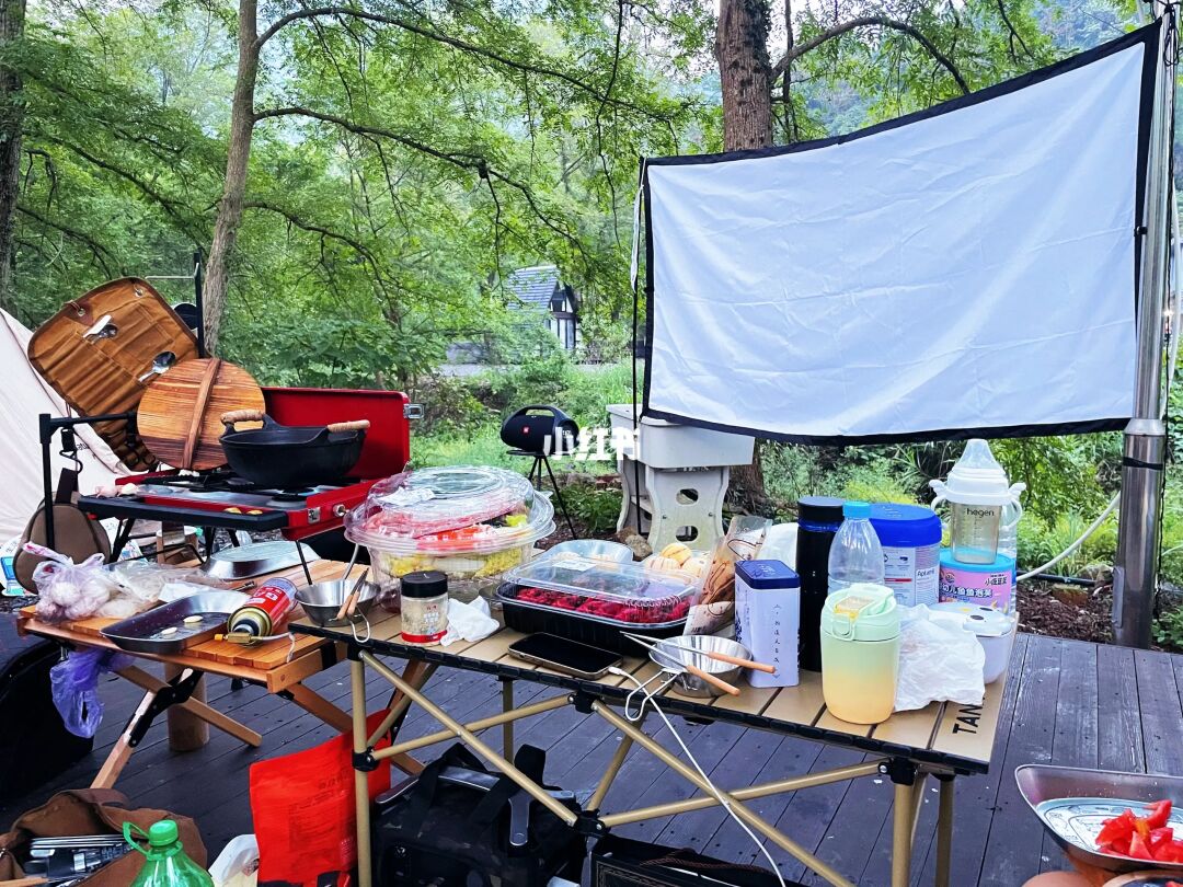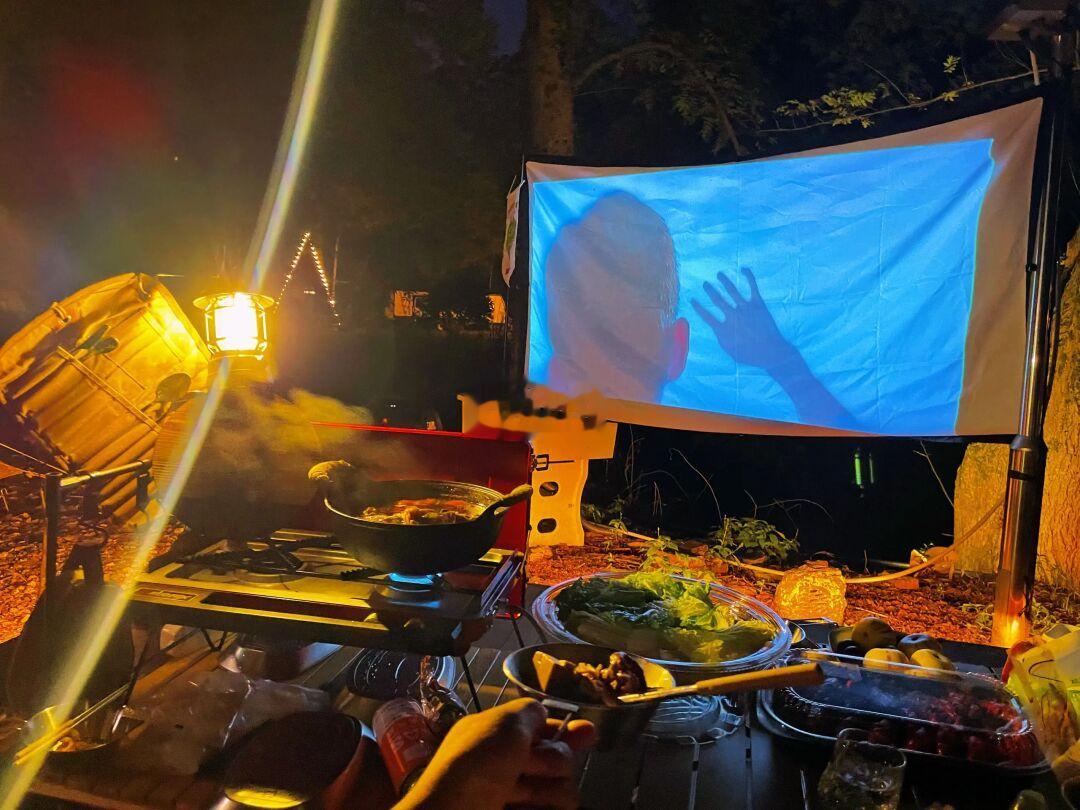 天幕、串灯、马灯、折叠桌椅、音响、火锅🍲、鸡尾酒🍹和小龙虾🦞再看一部电影🎬
