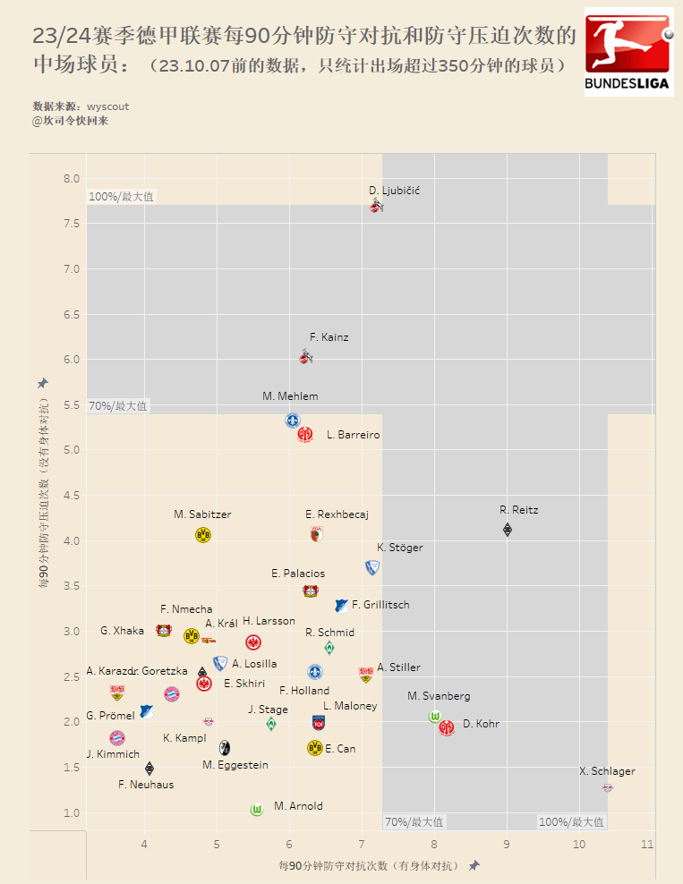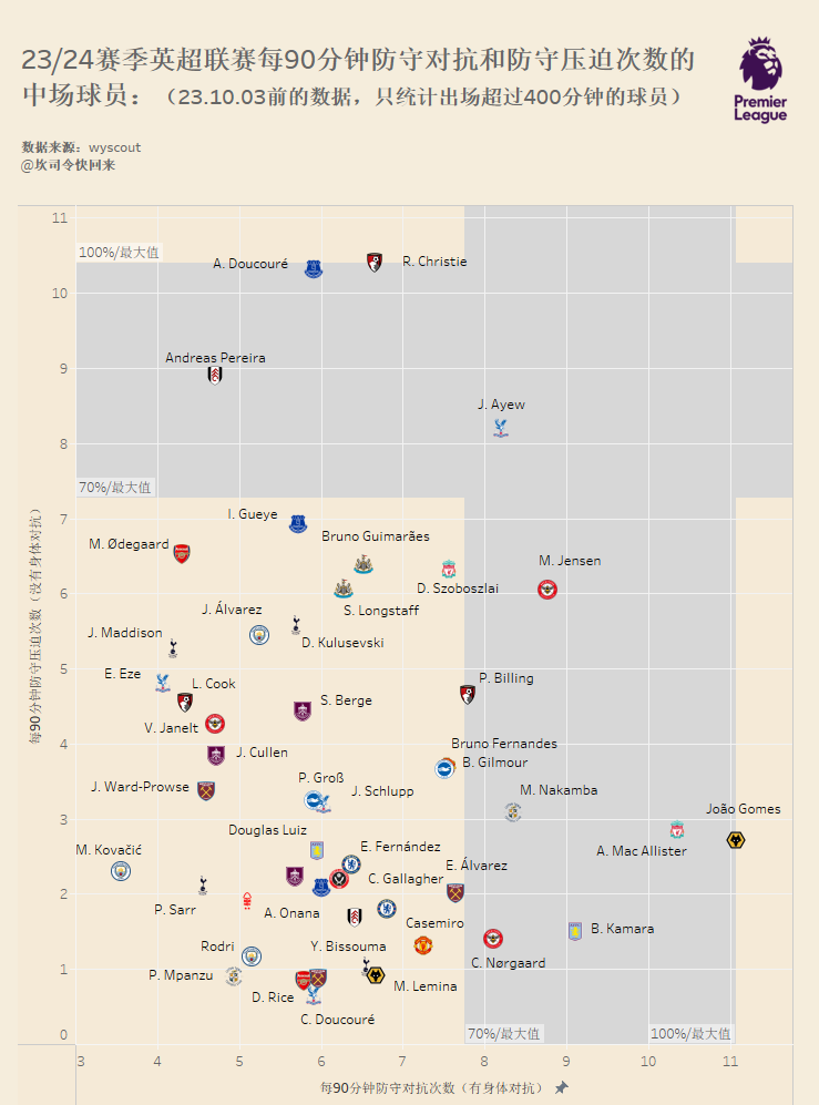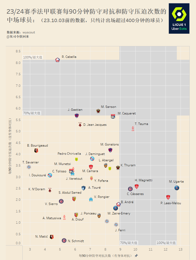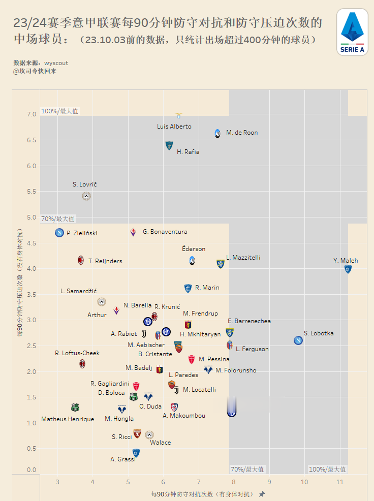 23/24赛季五大联赛每90分钟防守最积极的中场球员,不含拦截、争顶。#wysc