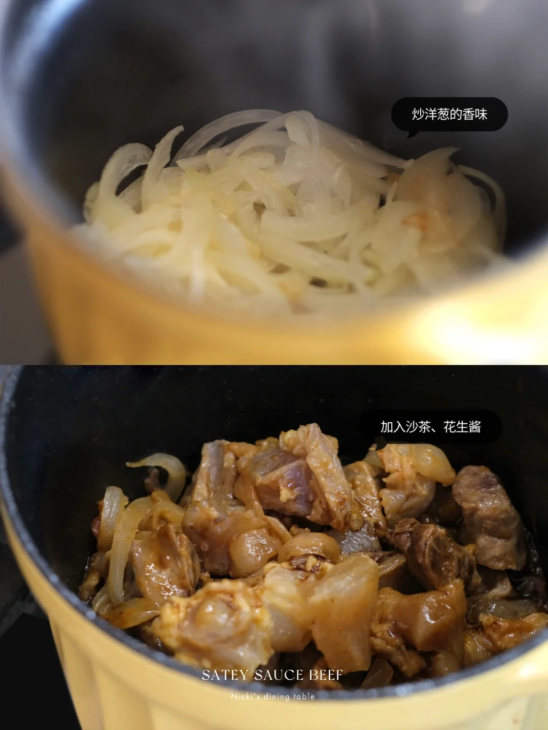 •将牛肉牛筋盛出,煮的牛肉汤也倒在碗中备用,锅中倒少许油,放入洋葱丝,炒出香味后,倒入牛肉牛筋,加2勺沙茶酱、1勺花生酱、2勺生抽、1勺糖,炒匀后,加入牛肉汤,盖上锅盖继续将电磁炉调至“炖牛腩”模式,再炖煮1个半小时。