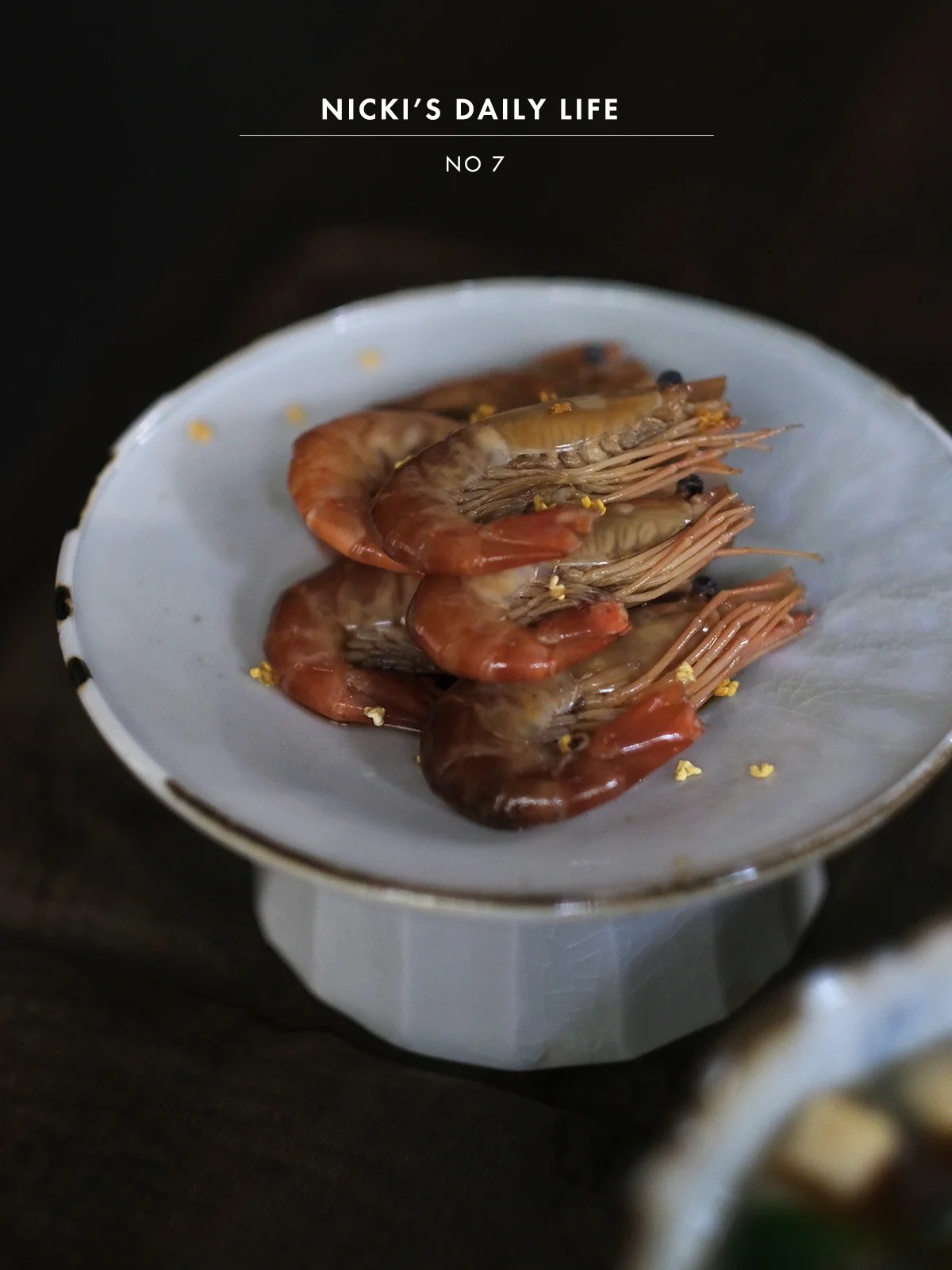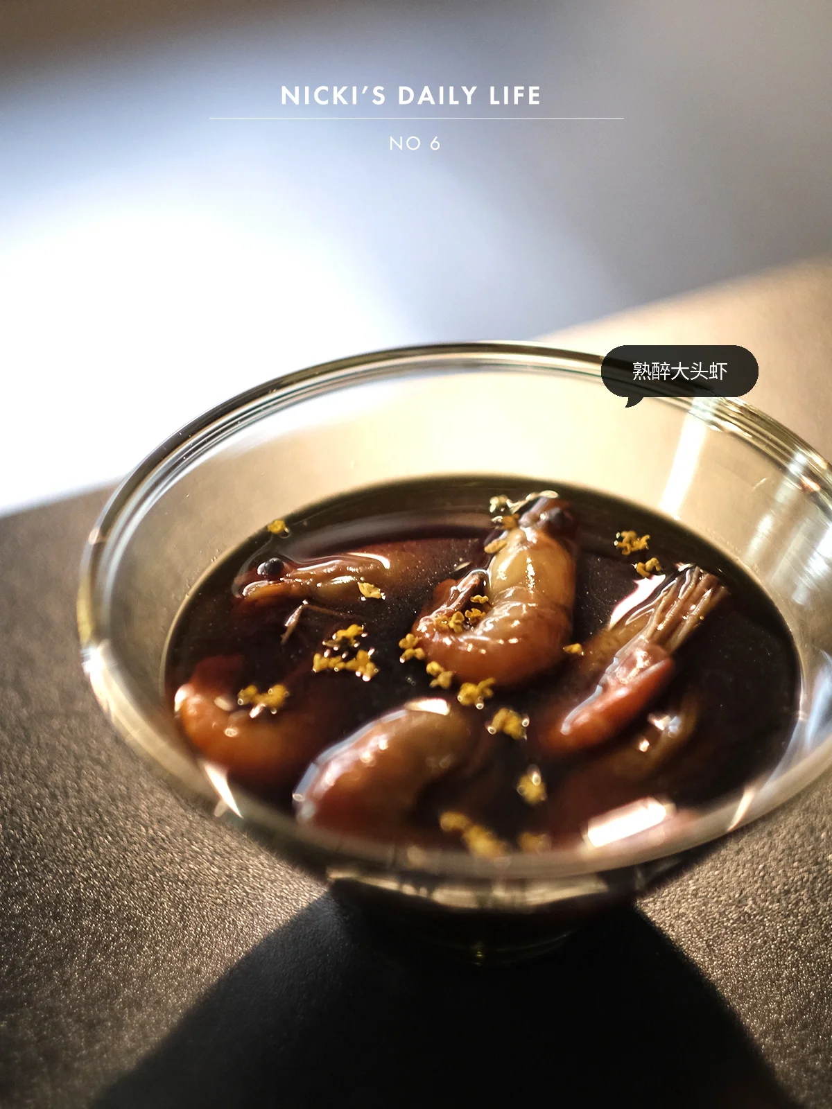 带着隔天晚上熟醉的大头虾,去工作室里简单吃个午餐,花雕酒与桂花的组合,经常会被用来醉螃蟹,但奈何自己绑了牙,对付不了它,取而代之用大头虾,吃起来反倒觉得更过瘾,嘬一口,甜甜的桂花味萦绕整个口腔,一个接一个停不下来…