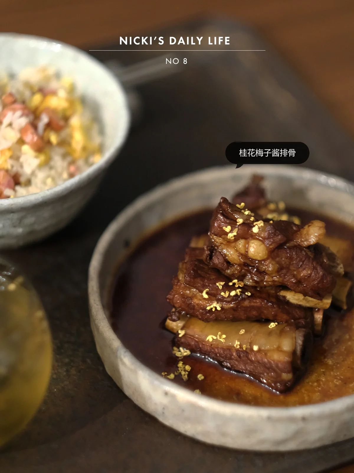 糖醋排骨现在我更喜欢的做法是把梅子酱替换掉大部分的糖和醋,口味比纯醋版的更胜一筹,酸甜中夹带着一丝清新果香,撒上干桂花,果香与花香的双重香气,这道菜不好吃也难。家属用金萱乌龙出汤在干桂花上,不论是热饮还是冰饮,馥郁雅致的香与甜,让人惊喜。