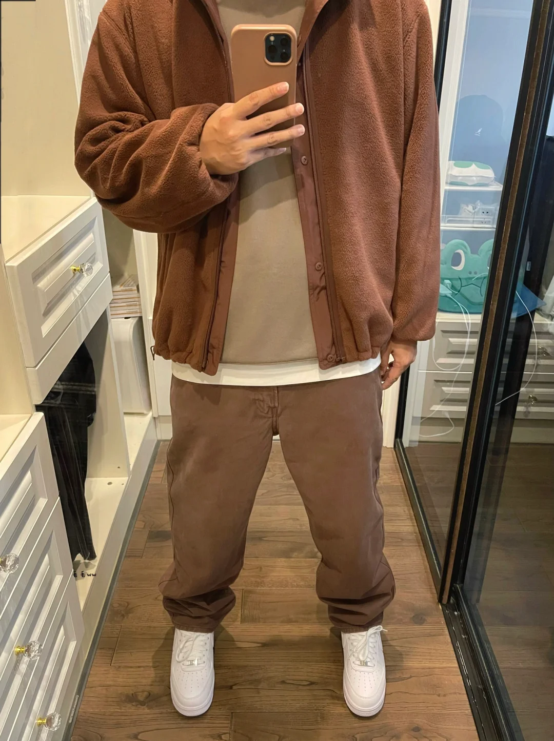 💥本季U栗色运用很多,高级感爆棚 🌰栗子配色实物暗红,褐色可以匹配 ☑️日常通勤穿搭,摇粒绒搭宽松丹宁 . —————— . ✏️本人178cm75kg 球鞋尺码265mm(正常EU42) . 💭以上均为我个人观点,不喜勿喷,欢迎讨论。
