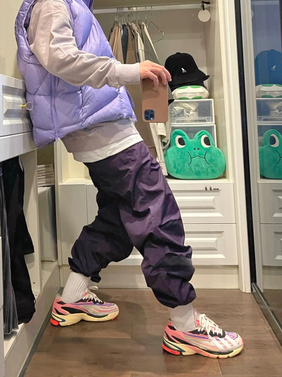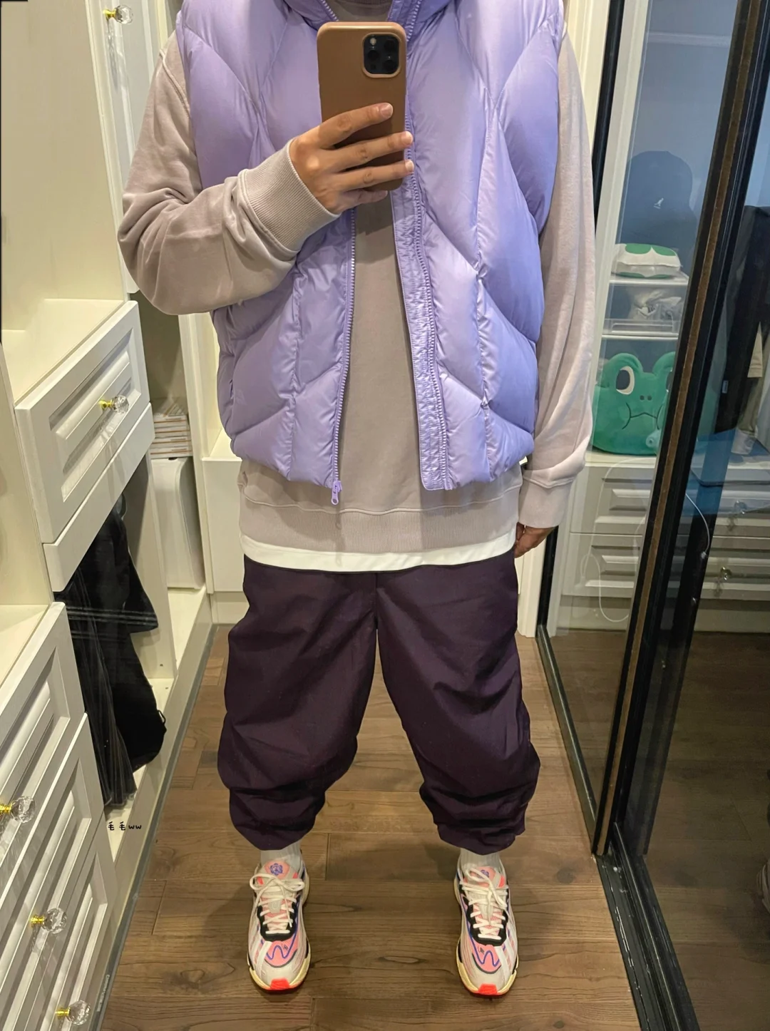 💟秋季氛围感,近色系搭配,紫色调层次 🪶棉服马甲叠穿利器,卫衣体恤简洁内搭 🪂降落伞裤束脚处理,Y2K复古跑很适合 . —————— . ✏️本人178cm75kg 球鞋尺码265mm(正常EU42) . 💭以上均为我个人观点,不喜勿喷,欢迎讨论。