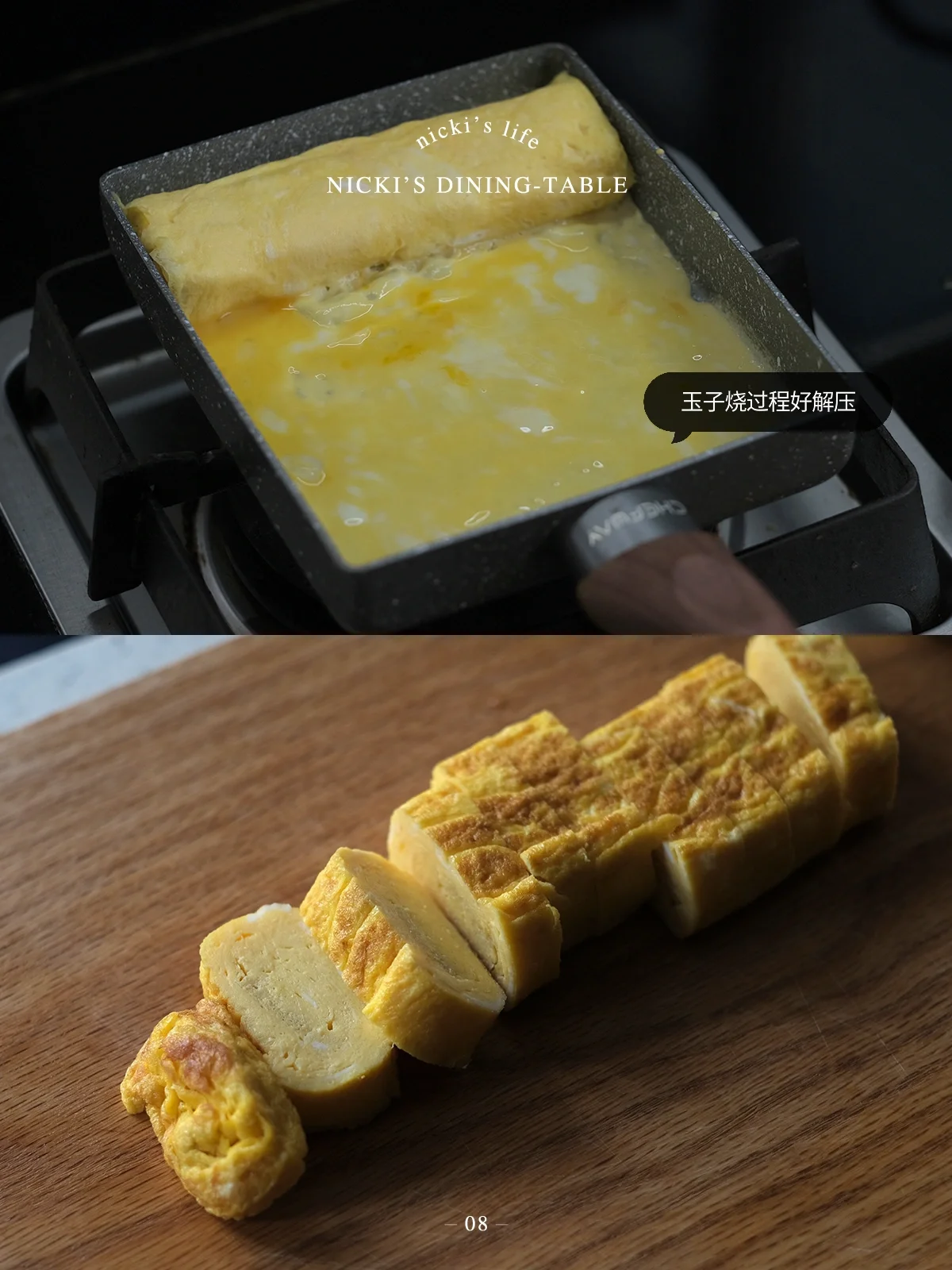 •打三个鸡蛋制作玉子烧,因为是照烧风味,口味偏甜,所以鸡蛋液里我加入了小半碗的牛奶和1勺糖,做好的玉子烧可以用卷帘卷紧压实一些,这样切的时候不容易散。