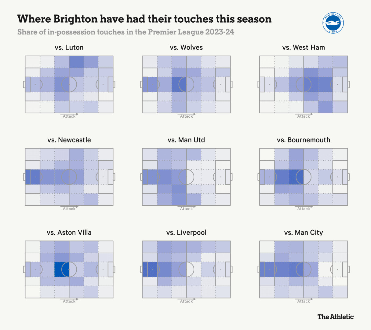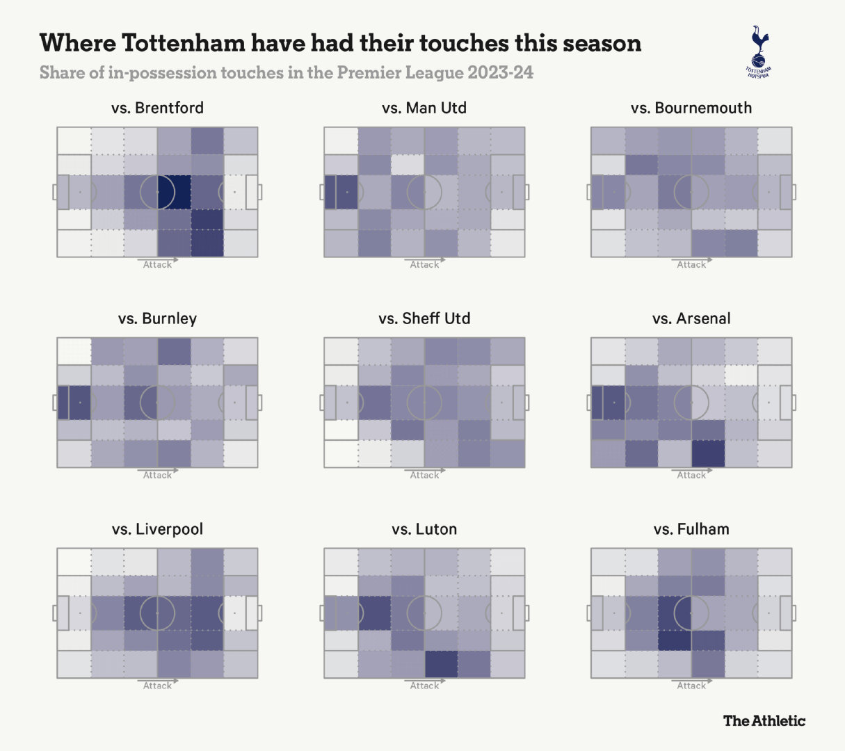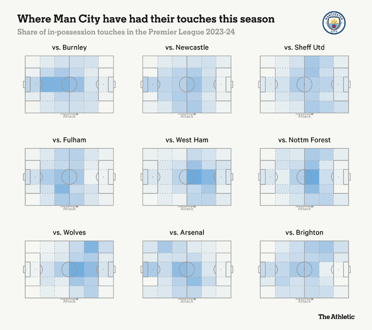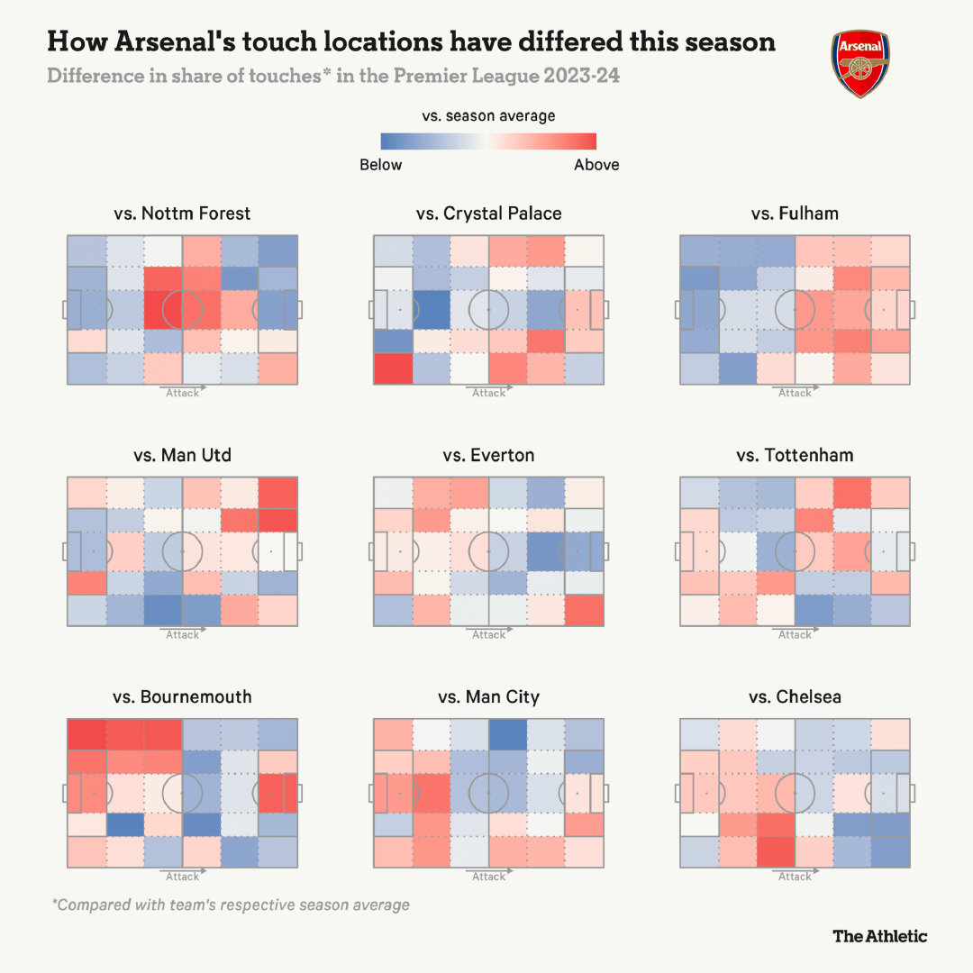 以下是部份英超球队在不同场次不同区域的触球统计,颜色越深则高于对手越多。