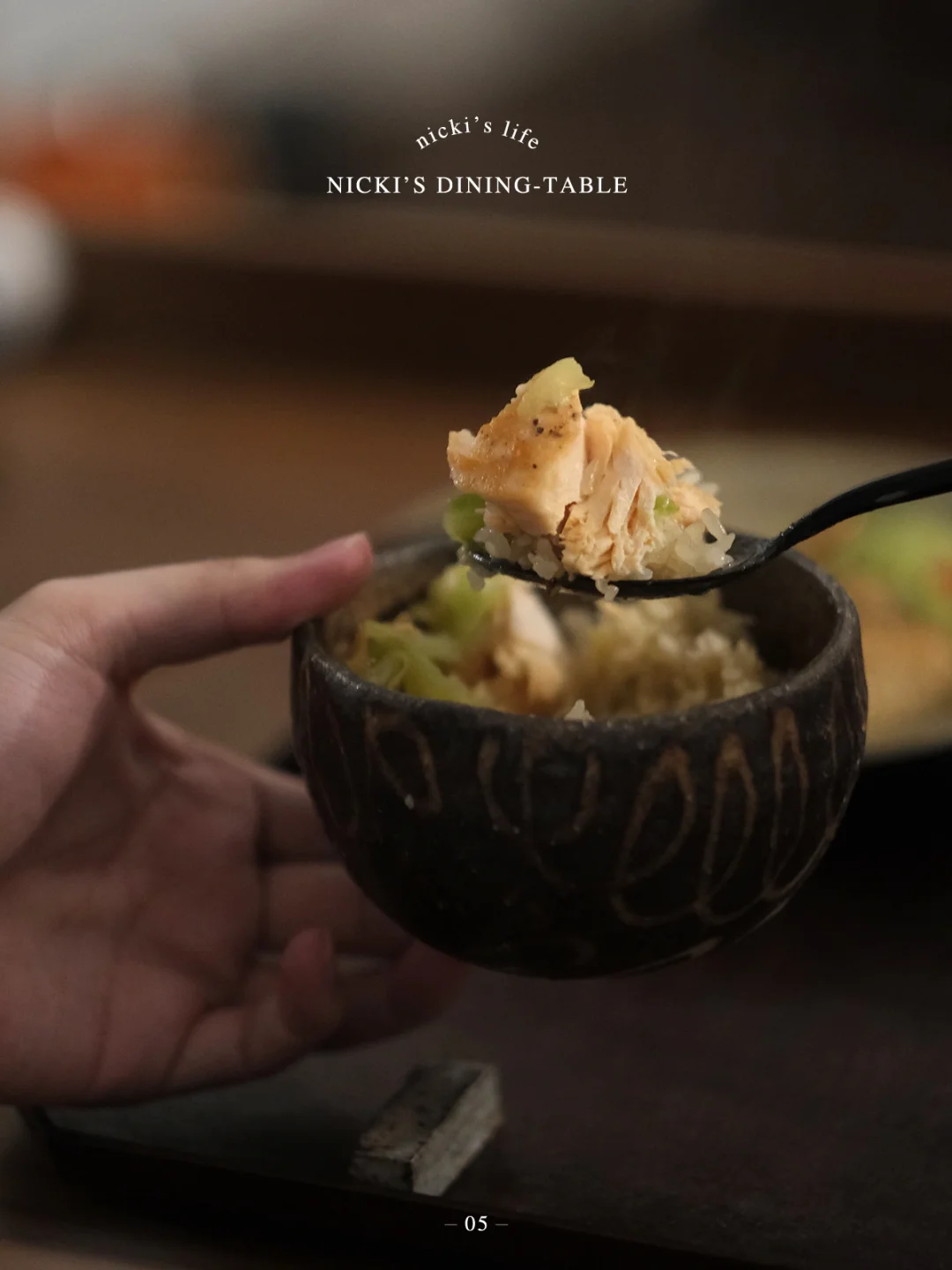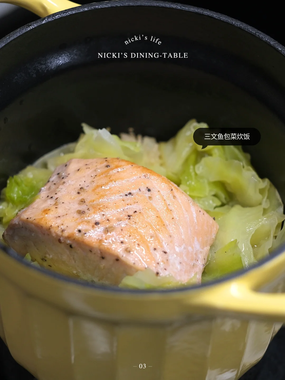 •将包菜和三文鱼平铺在米饭上,中火煮5分钟转小火煮15分钟即可。