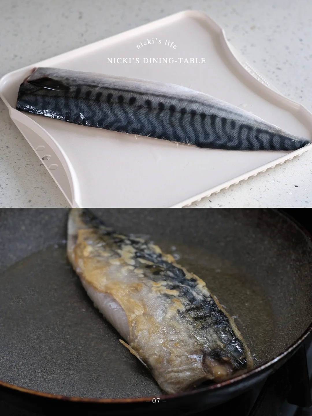 •加少许油,也可不放油,煎至青花鱼表面金黄即可盛出,再用厨房用纸吸掉表面多余的油分。