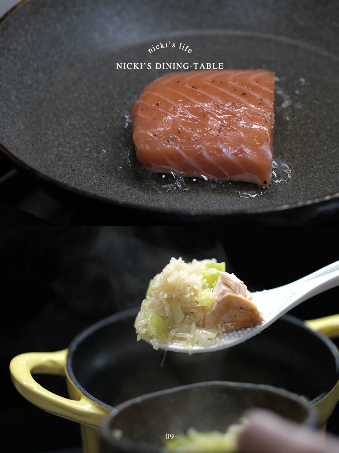 ❕三文鱼用的是冰鲜挪威三文鱼,色泽艳丽、肉质丰腴肥美。挪威对海产有严格的质量管理和追溯体系,三文鱼品质肉眼可见。用先煎后焖煮的方法,可以让鱼肉的水份牢牢锁住,鱼肉吃起来外酥里嫩,口感更丰富。三文鱼拥有丰富的蛋白质、维生素、Omega-3,营养的油脂才是正确的贴秋膘方式。