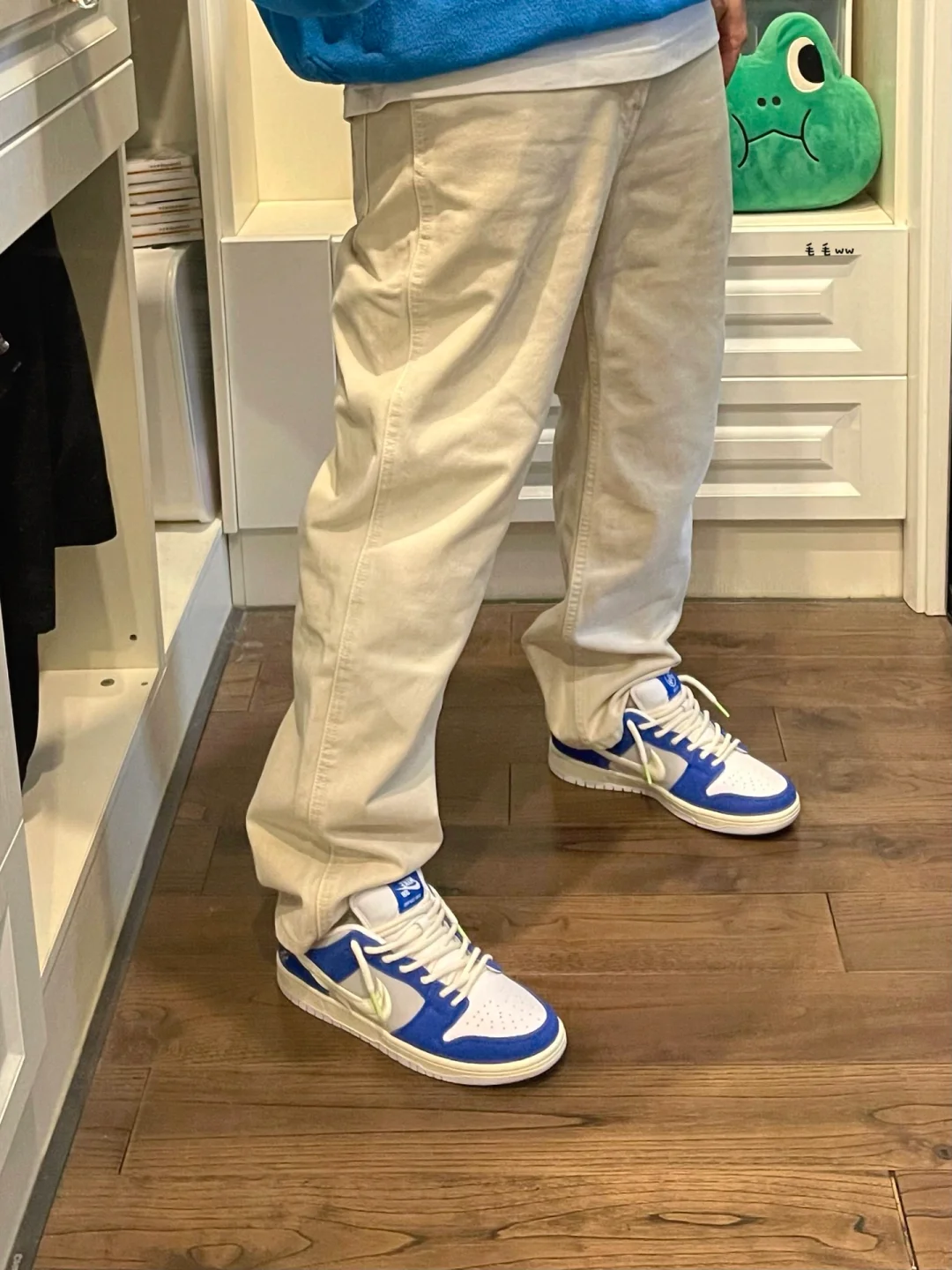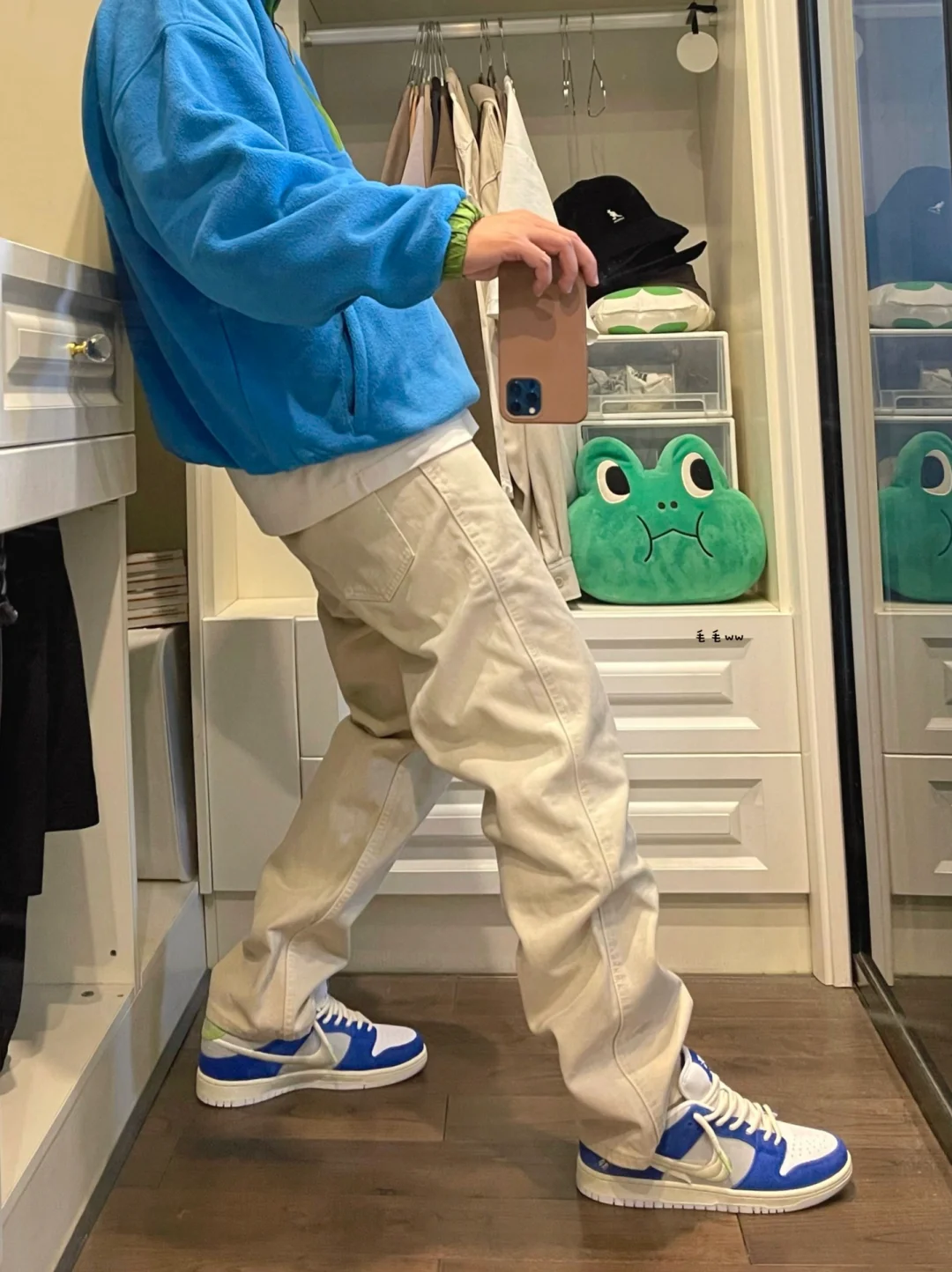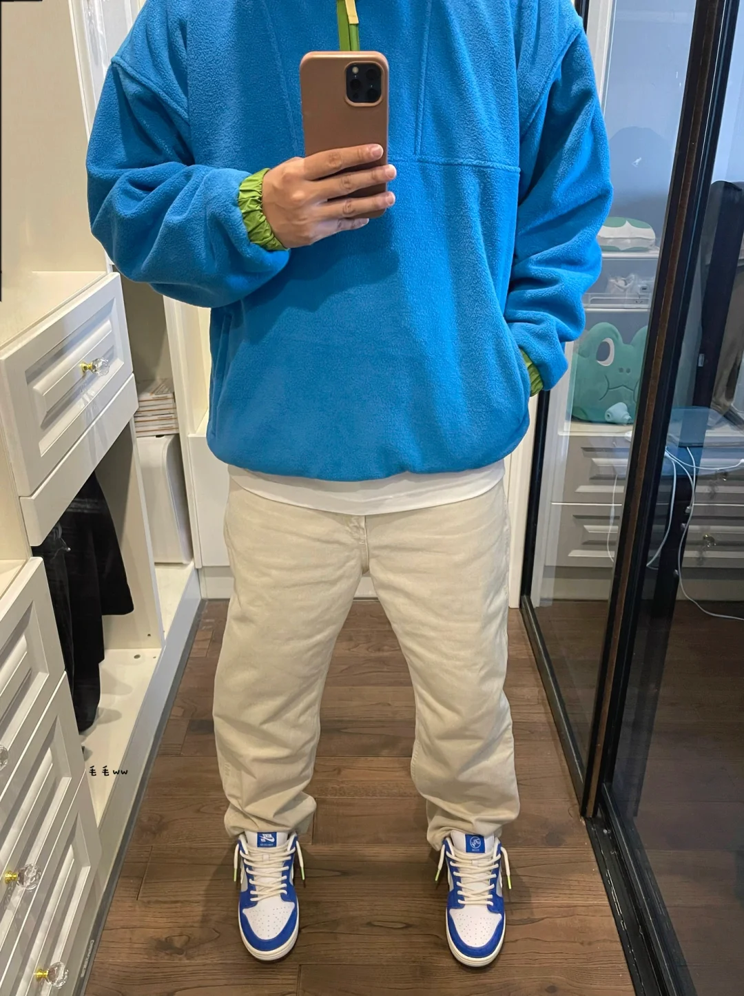 -喜欢蓝色的朋友看过来;连不擅长彩色系的我,也无法拒绝这种高饱和度蓝,尝试下蓝白色系穿搭 . -SW这件半拉链卫衣,喜欢正面摇粒绒,给人一种温暖的感觉;米白色裤装,丹宁布的褶皱恰到好处 . —————— . ✏️本人178cm75kg 球鞋尺码265mm(正常EU42) . 💭以上均为我个人观点,不喜勿喷,欢迎讨论。