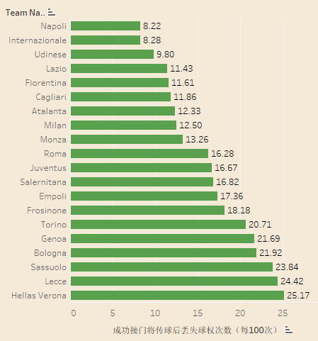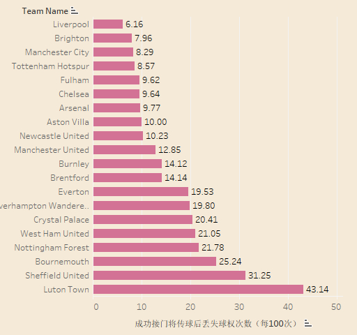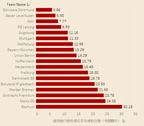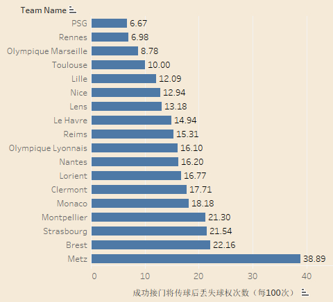 本赛季五大联赛球队在成功接到门将传球后丢失球权次数(每100次),一定程度上可以判断球队在后场组织进攻的成功率。