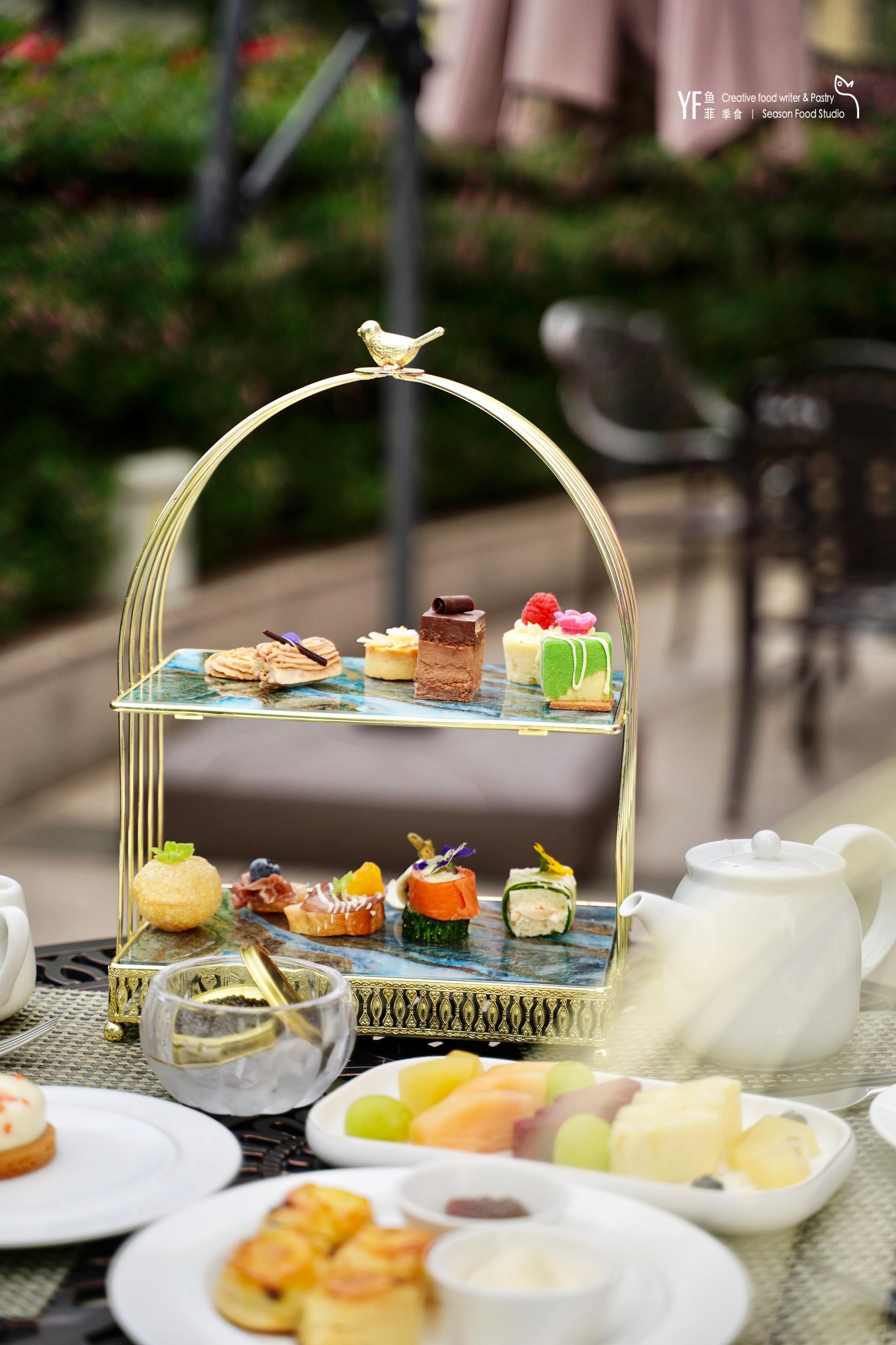 🍰双层下午茶套餐,里面有咸甜皆有的美味,除了搭配司康的果酱和奶油,还有新鲜的时令水果,口感丰富多样。