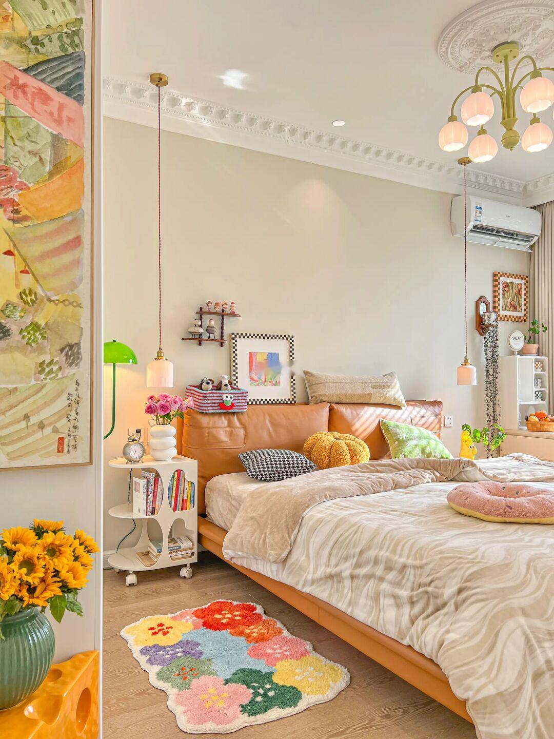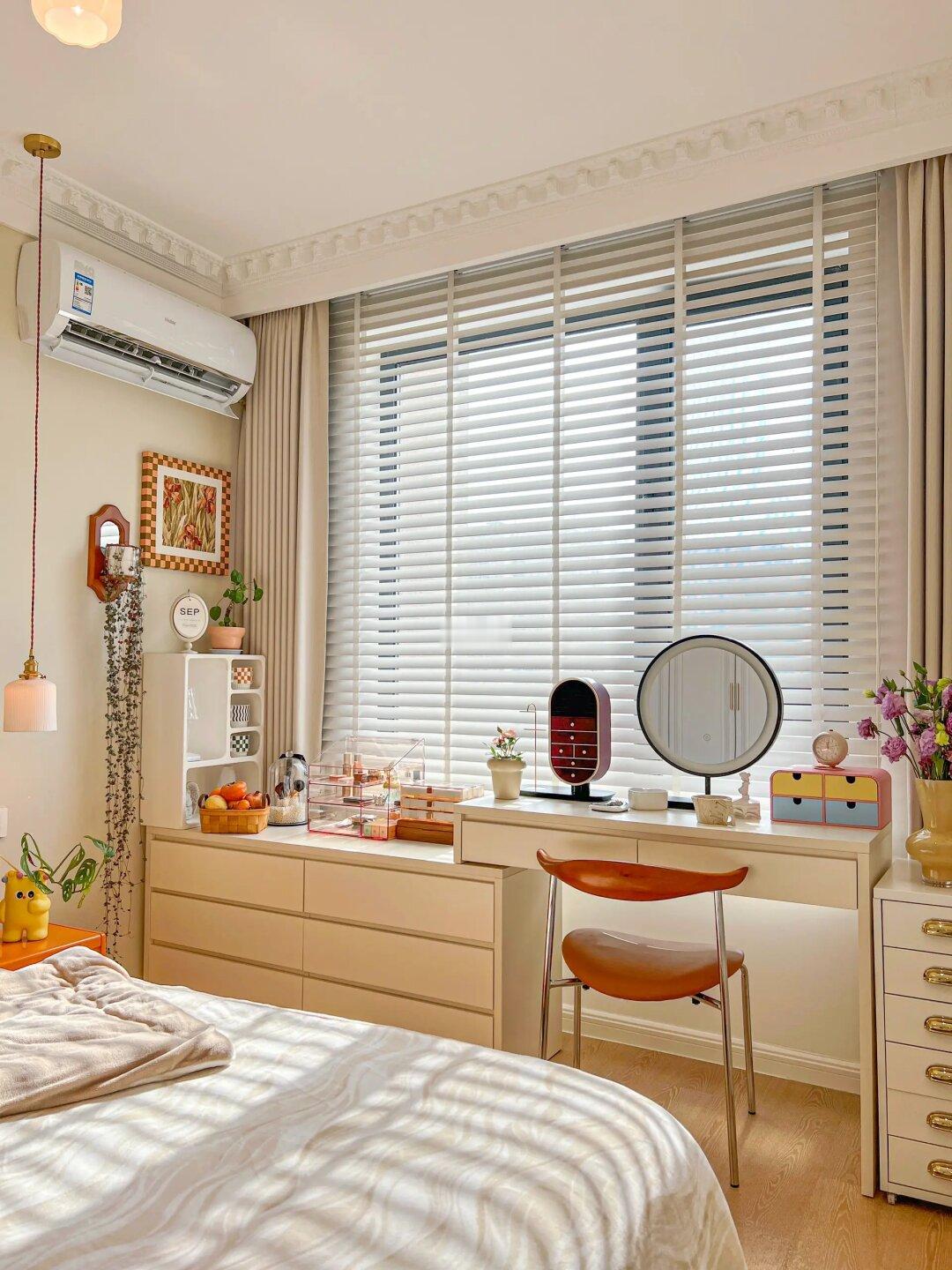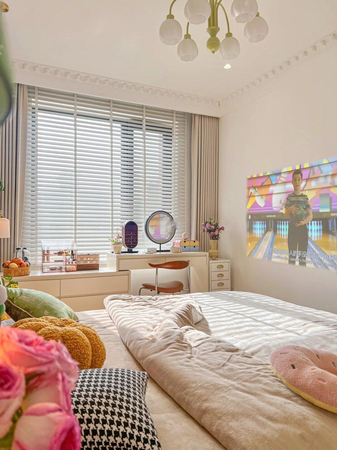 卧室背景墙是浅浅的奶油色,其余墙面纯白色