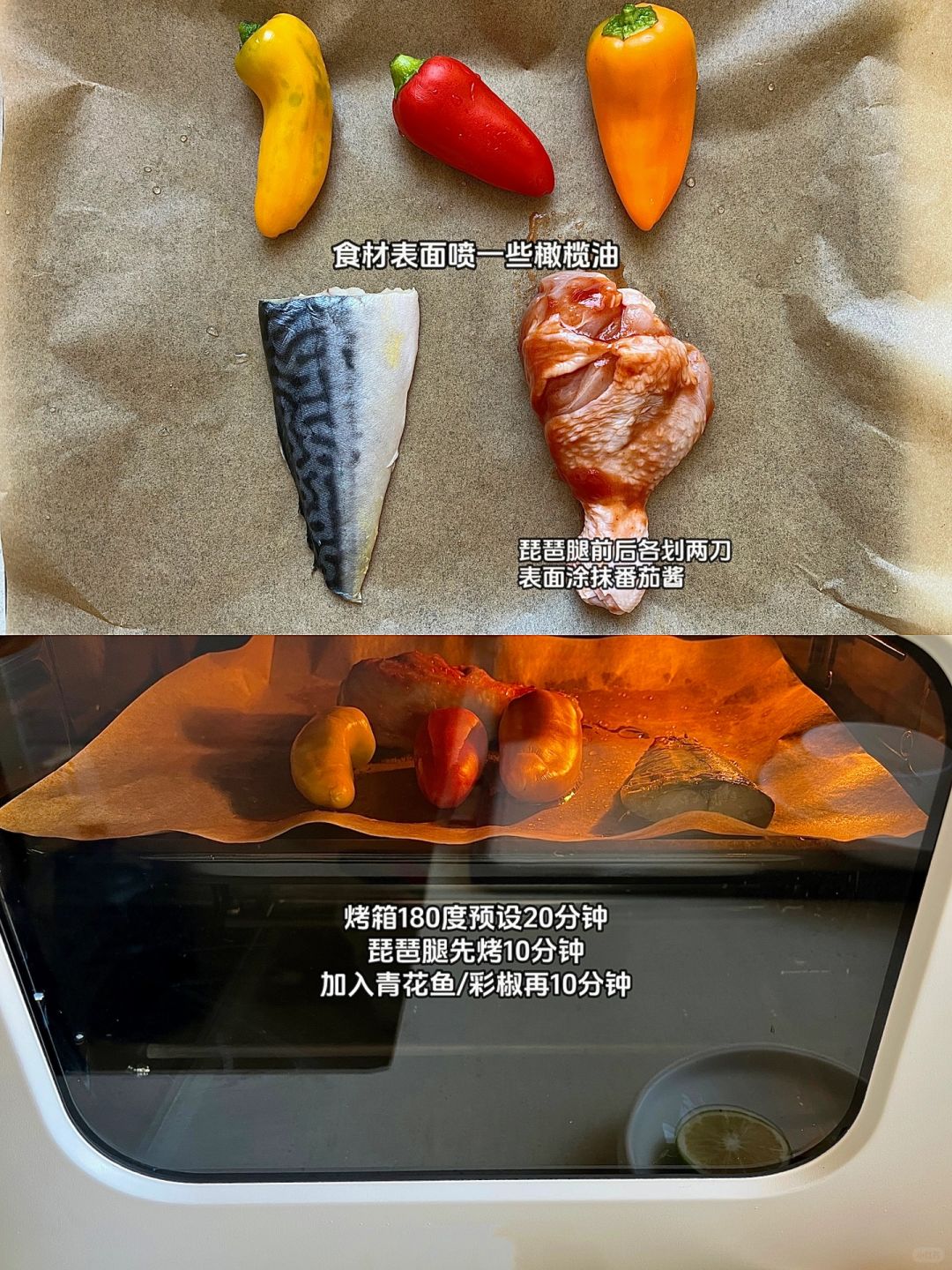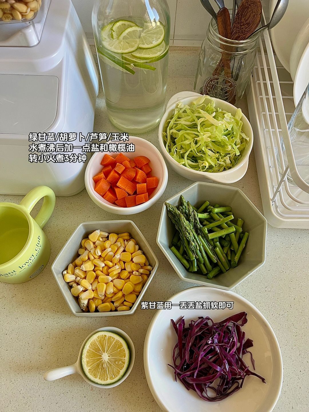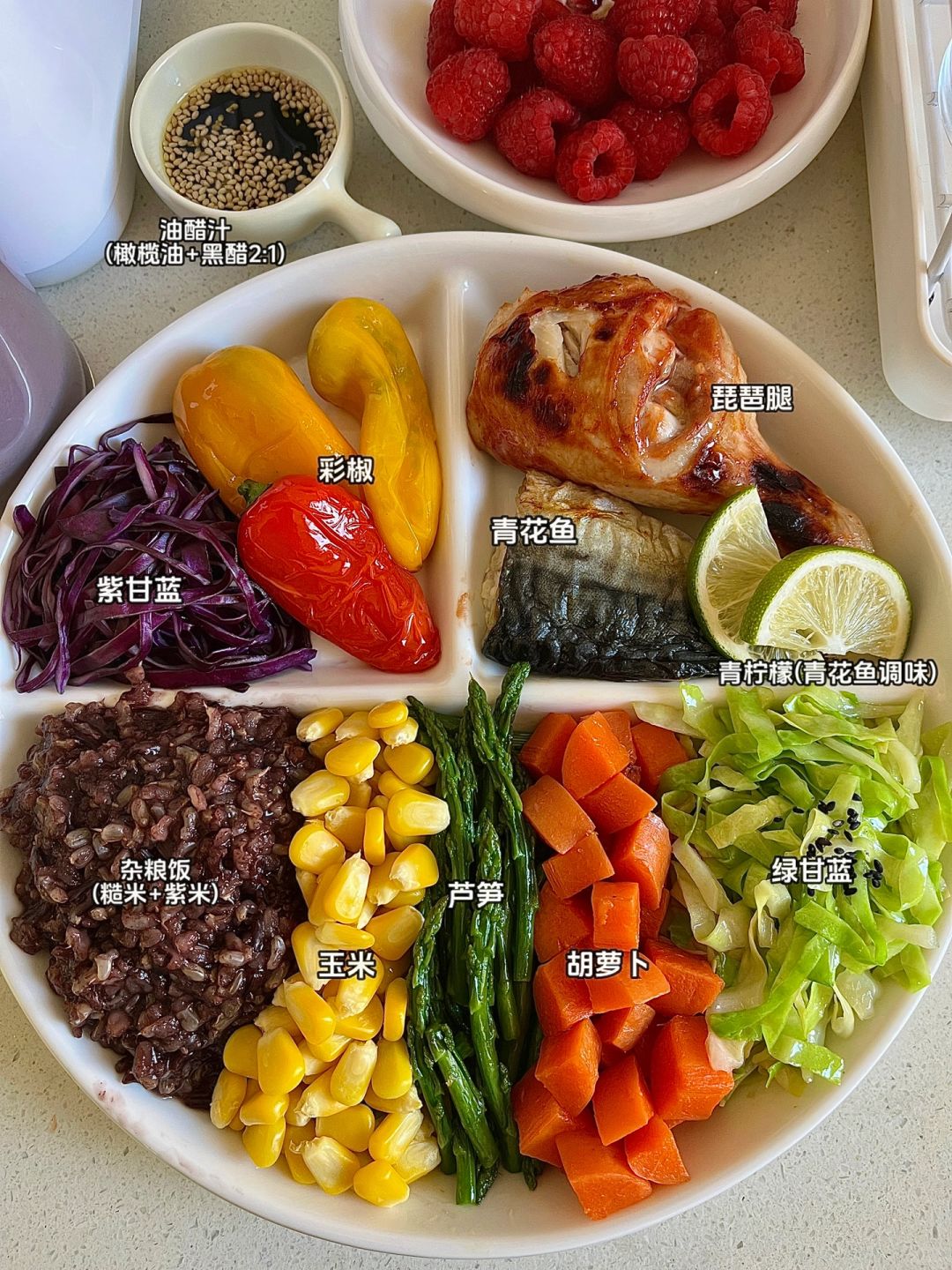 🏷今天午餐抗炎食物合集 🐟青花鱼🍗琵琶腿🍋青柠檬🫑彩椒 🍚杂粮饭(糙米+紫米)/紫甘蓝🌽玉米 🥕胡萝卜/芦笋/绿甘蓝紫薯/桑葚 黄豆/树莓/石榴/橄榄油/黑醋 -