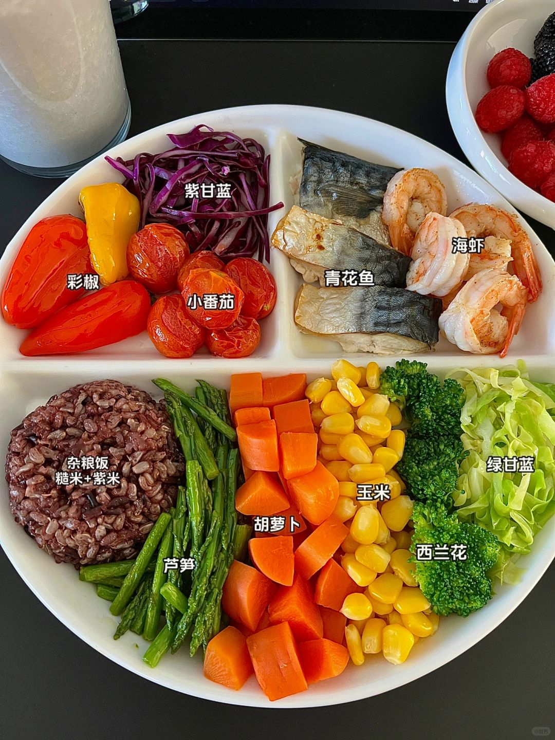 🏷今天午餐抗炎食物合集 🐟青花鱼🦐海虾🍅小番茄🫑彩椒/紫甘蓝 🍚杂粮饭(糙米+紫米)🥕胡萝卜/芦笋/桑葚 🥦西兰花🌽玉米/紫甘蓝/黑芝麻/黄豆/树莓 - 今天又喝了新调配的热豆浆饮~ 近期分享的饮品都是热饮 入冬了,女生宝子们更要在意自己的饮食~ 减少生冷食物的摄入,多看看二条近期的分享 一起把热饮做起来,关爱好自己❤️ -
