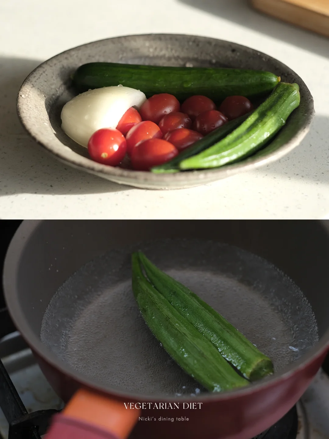食材:小番茄、秋葵、黄瓜、黄洋葱(五辛者可以忽略)