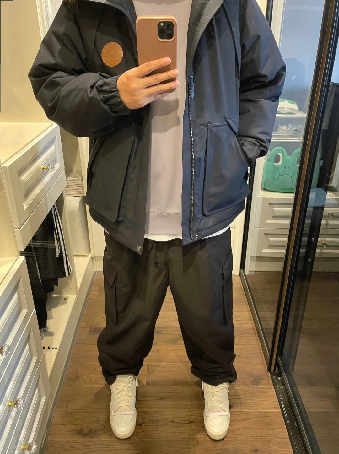 -工装风穿搭,容易适配球鞋;侧面大口袋,基本都能驾驭,上装用简洁的羽绒服叠穿 . -U家本季降落伞裤,相较上一季,做了大廓形,穿着非常宽松,小遗憾就是面料偏薄 . —————— . ✏️本人178cm75kg 球鞋尺码265mm(正常EU42) . 💭以上均为我个人观点,不喜勿喷,欢迎讨论