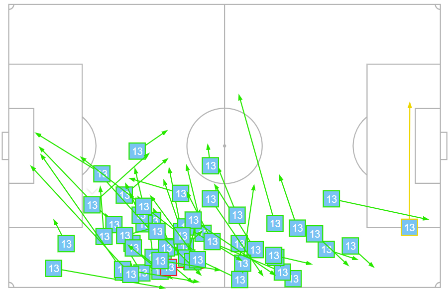 达米安56次传球,成功55次;