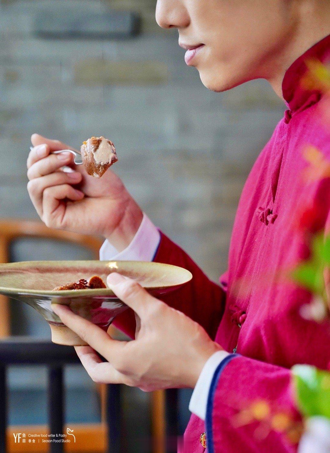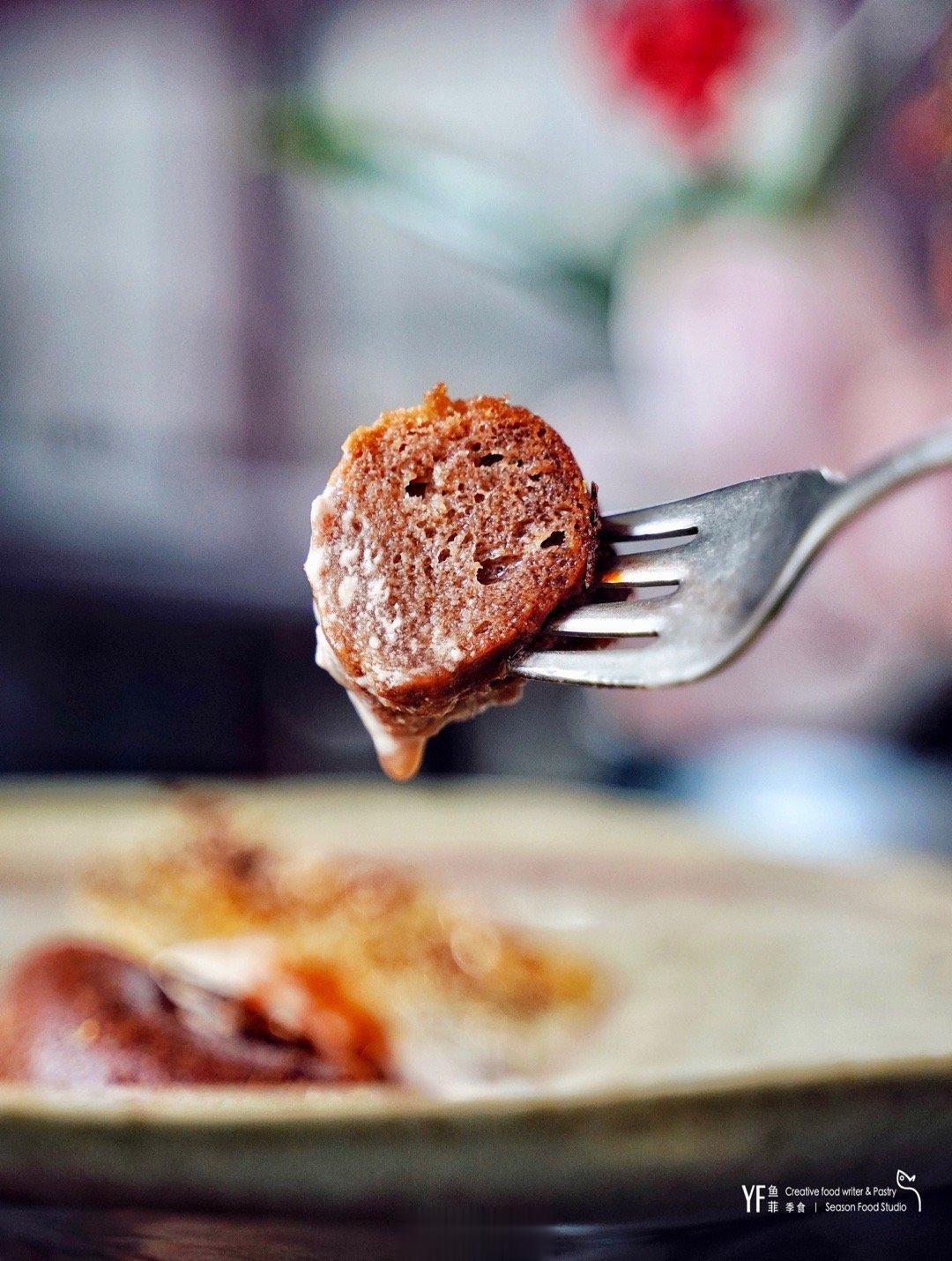🍮捌粑芭巴,其实是一款中西结合,融入法芙娜巧克力的一款创意甜品。取捌种主要食材,以东方的糖油粑粑搭配西方的朗姆巴巴蛋糕为主题。而点睛的灵魂蘸酱,则是以法芙娜的欧帕丽丝33%白巧克力🍫和糯香普洱茶做的打发奶油佐味。搭配巴巴蛋糕,松软淳厚;而与Q弹的糖油粑粑一起品尝,轻柔的法芙娜巧克力甜味之后,慢慢氤氲出的糯香,就像嚼着巧克力融合米香的珍珠奶茶,满口生香。