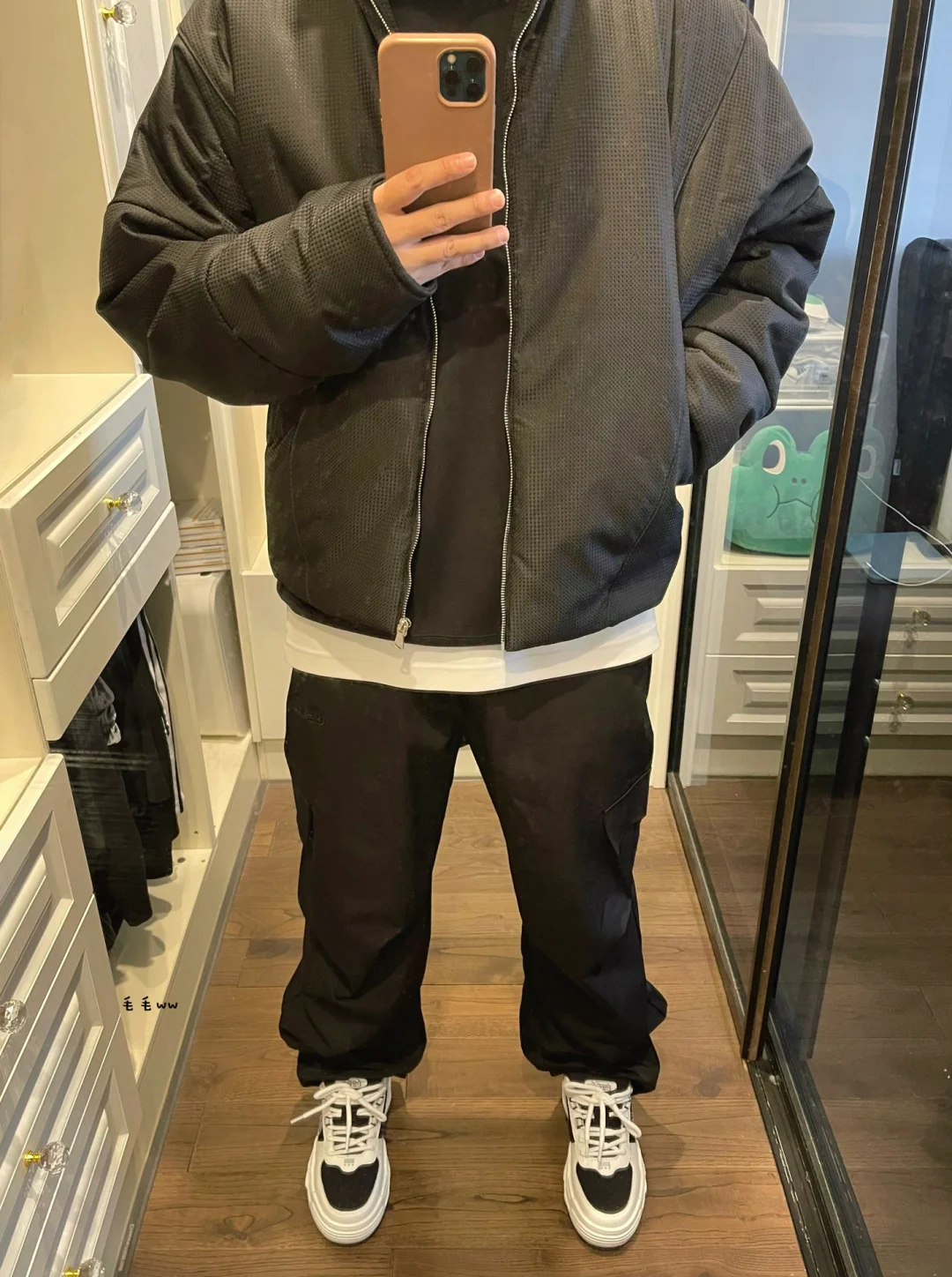 -秋冬有效穿搭,经久不衰的黑白;年轻小孩更喜欢彩色系,像我这种上年纪的才慢慢懂得黑色 . -短款棉服搭配卫衣体恤,瞬间有层次感;直筒裤修饰腿型的同时,球鞋与裤脚堆叠也很有感觉 . —————— . ✏️本人178cm75kg 球鞋尺码265mm(正常EU42) . 💭以上均为我个人观点,不喜勿喷,欢迎讨论。