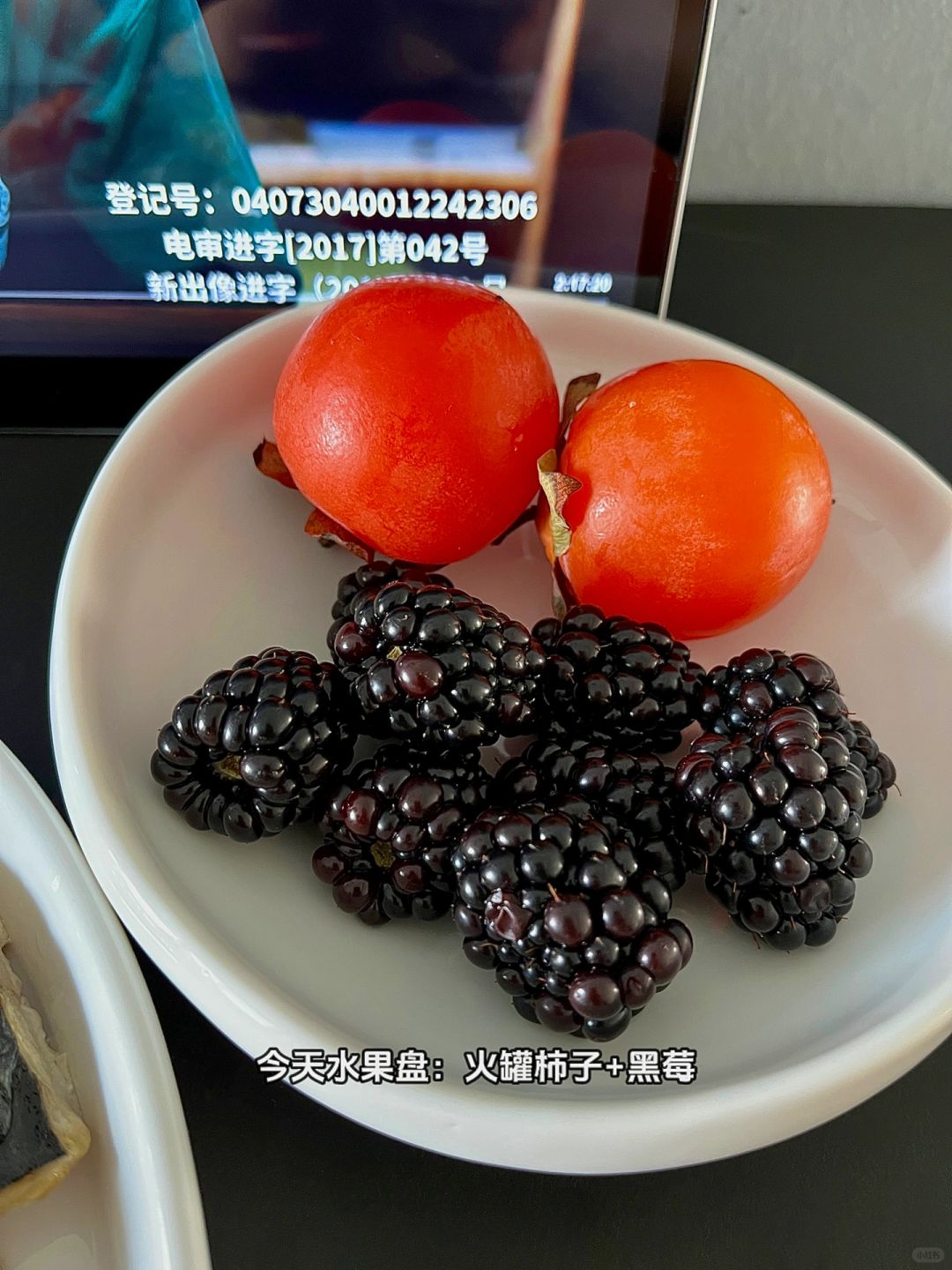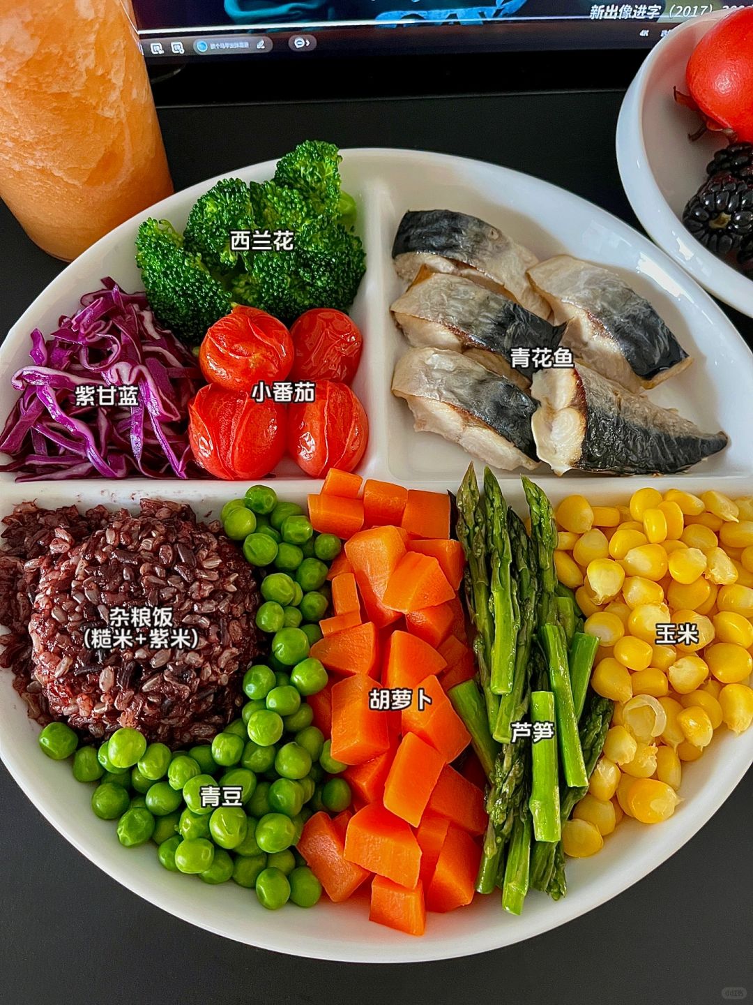 🏷今天午餐食物合集 🐟青花鱼🥦西兰花🍅小番茄/紫甘蓝 🍚杂粮饭(糙米+紫米)/青豆🥕胡萝卜 🌽玉米/芦笋🍎苹果🍍菠萝/柿子/黑莓 - 午餐和早餐比较大的不同就是在碳水上 会用杂粮饭替换南瓜、红薯等 在增强饱腹感的同时还能摄入益生元 -