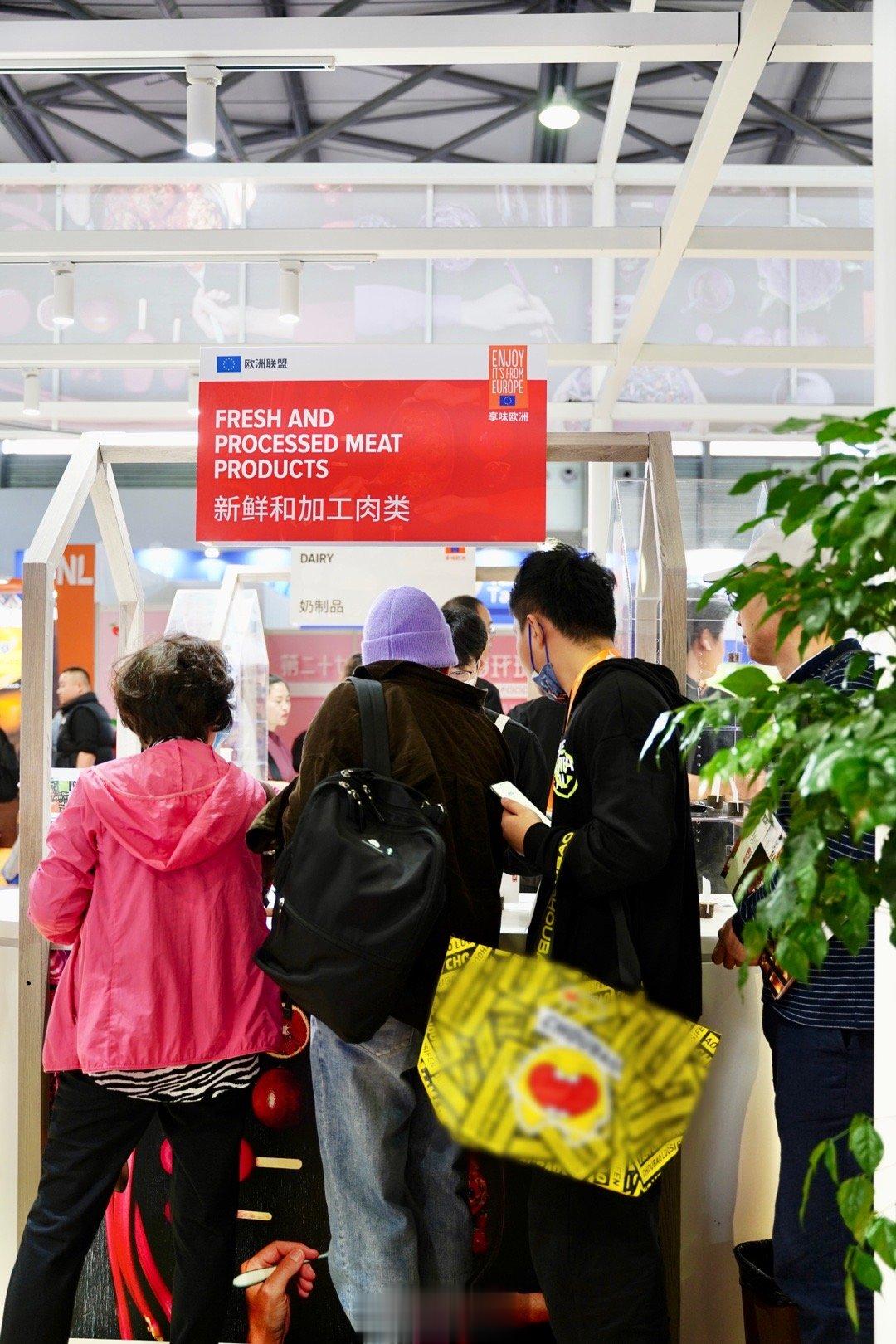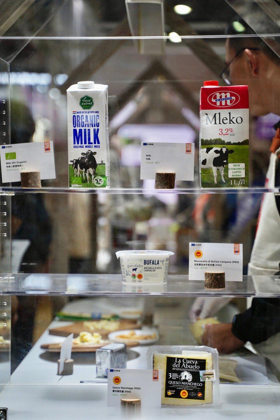 这次欧盟馆的主题是"多彩欧洲美味,纵享万千搭配",也是欧盟正在中国推广的活动。现场除了各种高品质乳制品,还有许多欧洲优质的食品和饮料。欧盟严格把控农产品,从安全性、高质量、真实性和可持续性来推动全球消费者对欧盟饮食需求的核心支柱。由于在种植和生产的每个环节都有全方位的安全和质量标准,中国消费者可以放心地享用来自欧洲的食品和饮品。目前大约有200个来自欧洲和中国的地理标志(GI)受到协议保护,以防止假冒和仿制。这不仅为双方的贸易带来好处,也为消费者介绍了来自双方的丰富烹饪传统和文化传统地区中具有真实性的可靠产品。