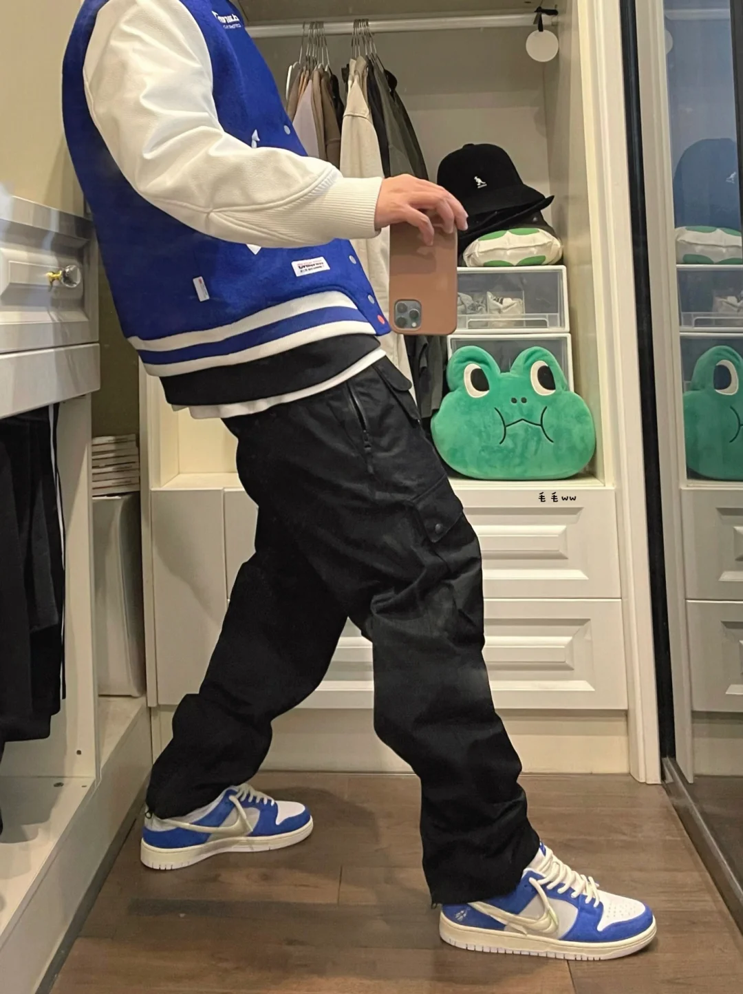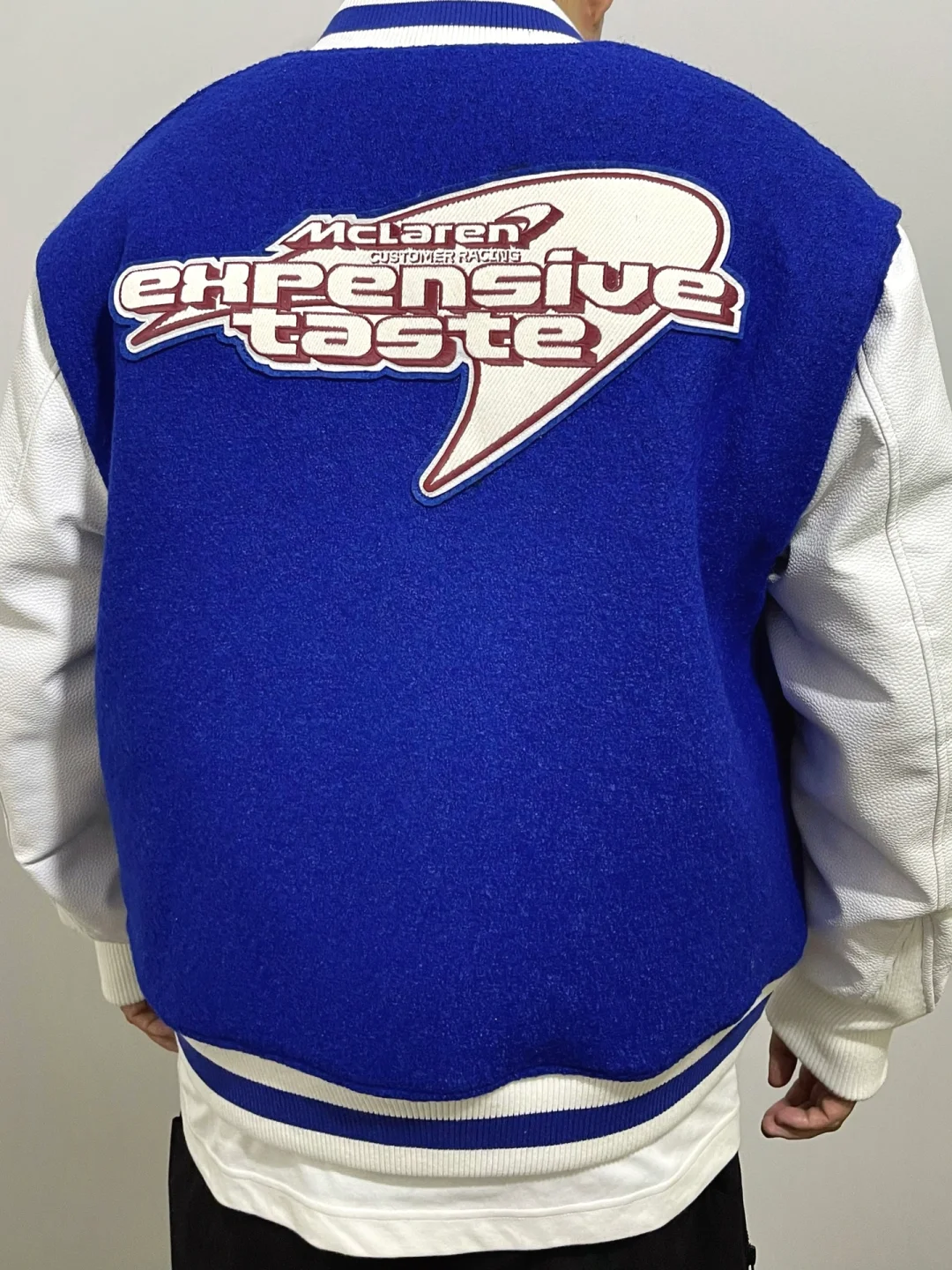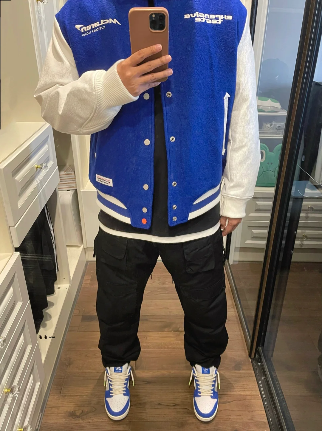 -谁能拒绝蓝色系穿搭,黑白色系非常有效,高饱和度蓝色增加辨识度 . -棒球夹克想要穿好看,磅数一定要够;内里夹棉,皮袖瞬间提升质感 . —————— . ✏️本人178cm75kg 球鞋尺码265mm(正常EU42) . 💭以上均为我个人观点,不喜勿喷,欢迎讨论。