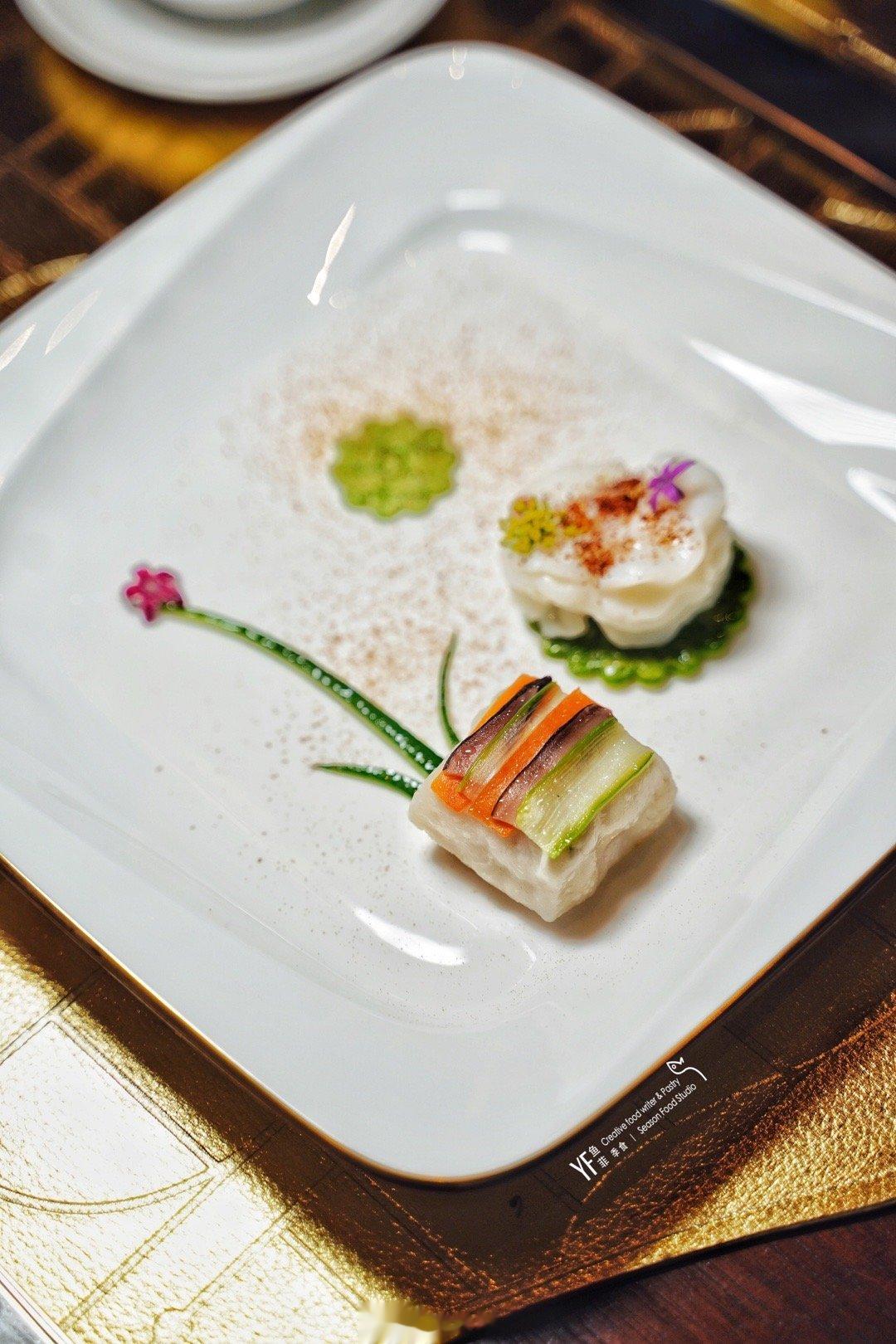 🌰像形锥栗法国鹅肝,栗子打成粉包裹酒渍过的鹅肝泥,底部再以新鲜生脆的苹果承味,微酸脆甜,解腻