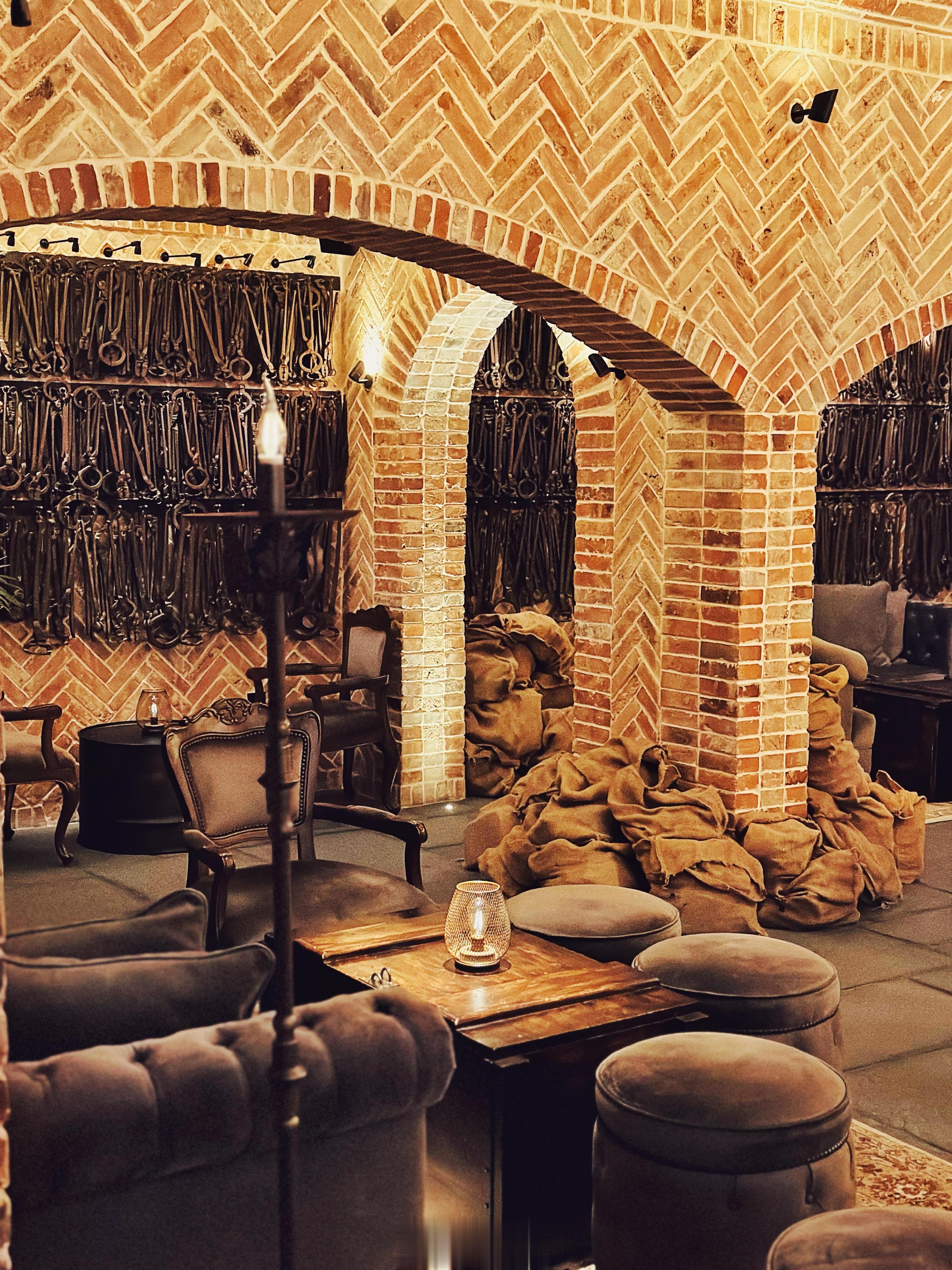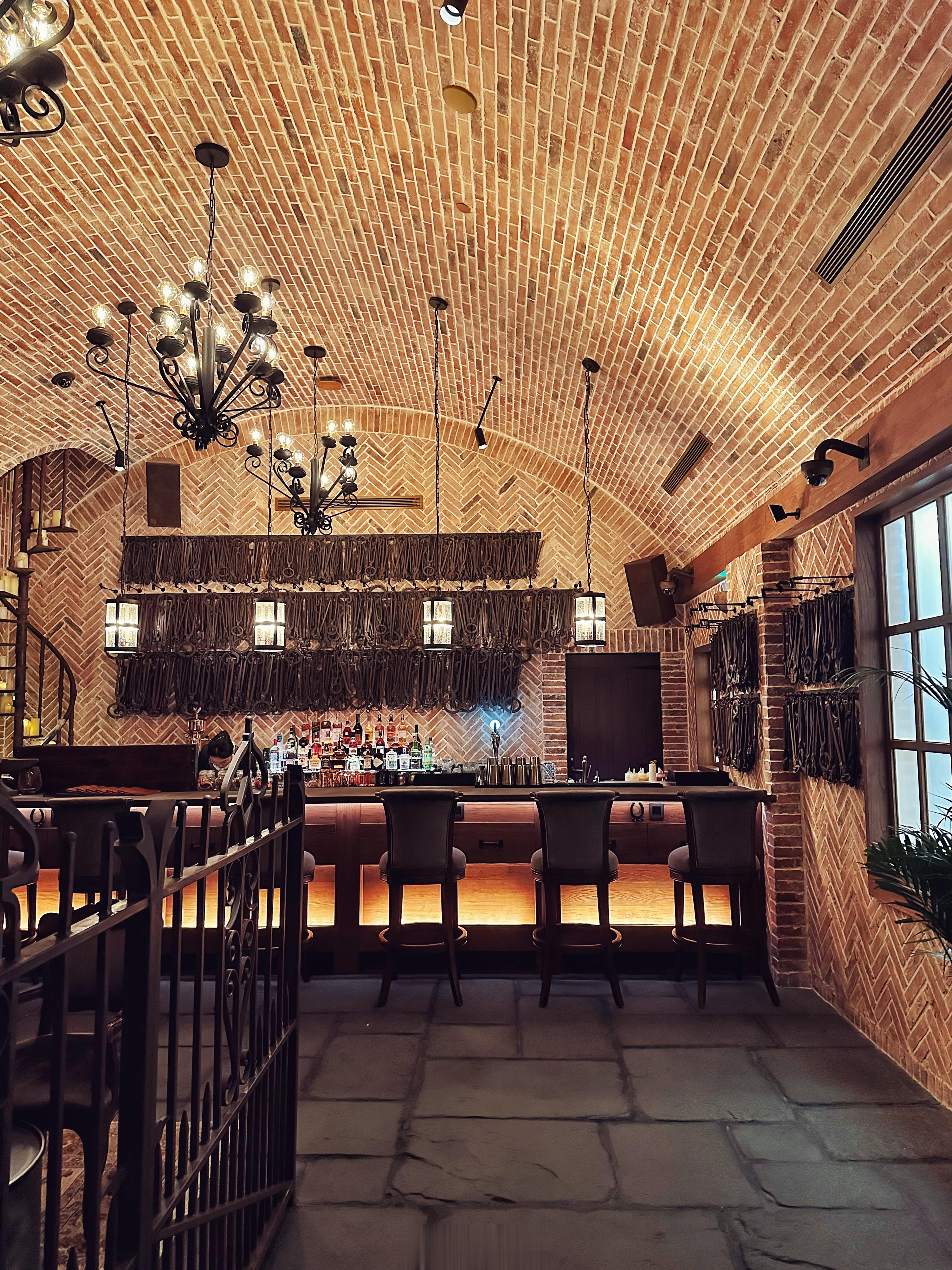 朋友带我去的这家妙泰9月刚刚开业。是由曾任职于多间米其林星级且屡获殊荣的餐厅女主厨Nuch主理。整个空间被富有戏剧感的设计风贯穿全场,前厅以蹄铁匠工作间为设计灵感,铸铁锻造工具、拱形砖砌的天花板,再现18、19世纪伦敦昔日马厩的英伦风情。
