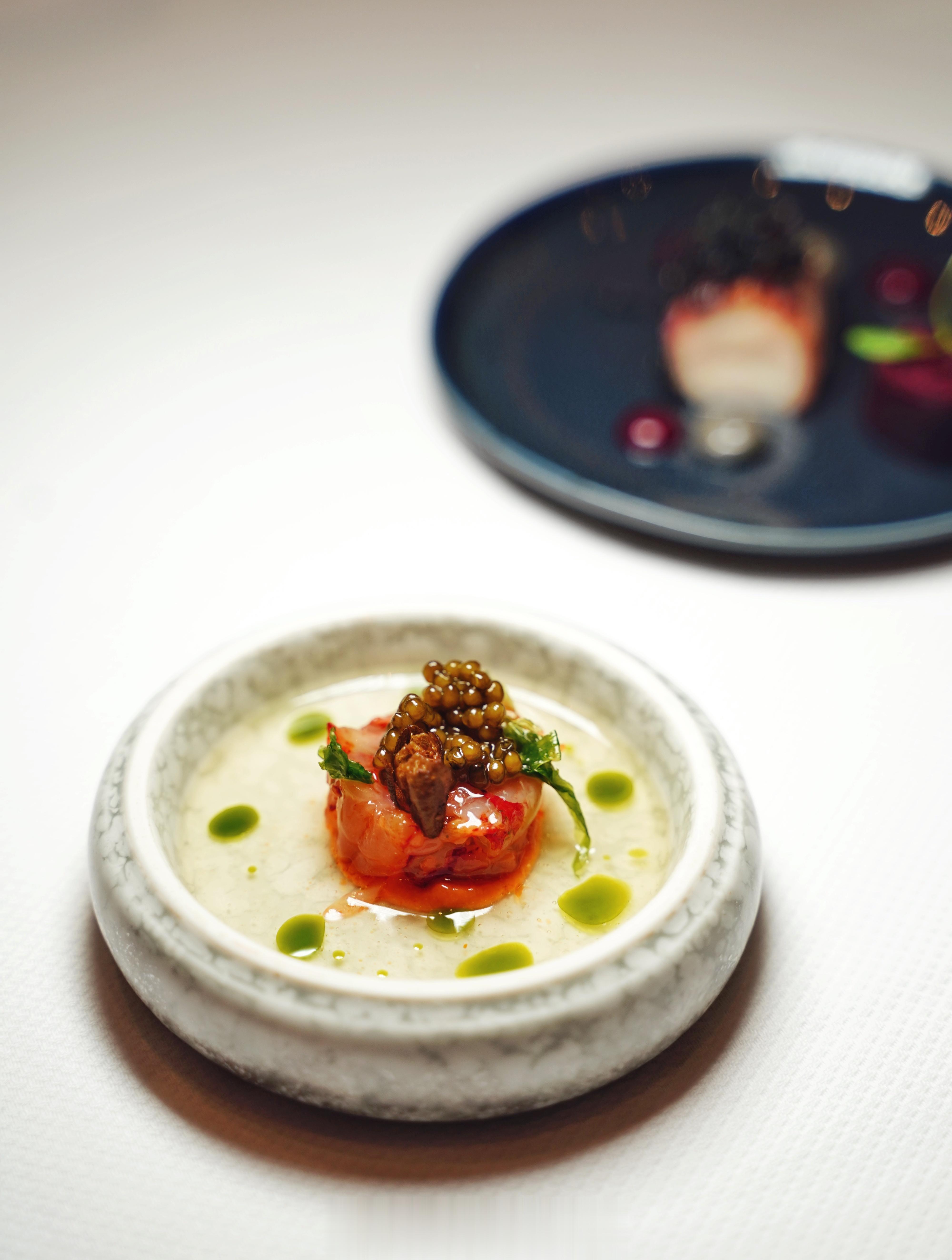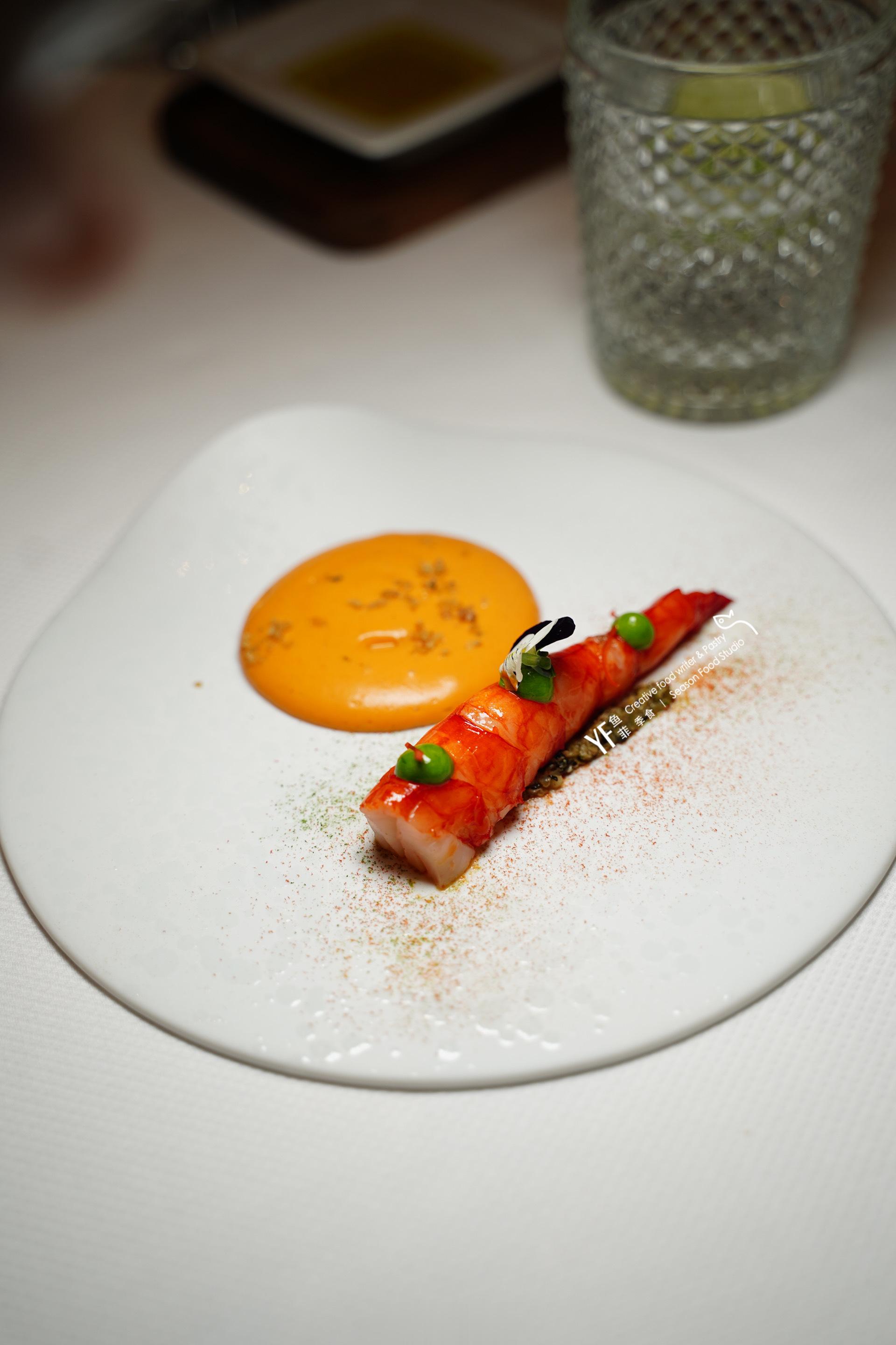 🦐关于菜品,开胃菜红虾用海鲜高汤煮过,再用洋葱、培根、面包煮汤打成泥相配,口感Creamy,虾肉弹牙鲜甜。