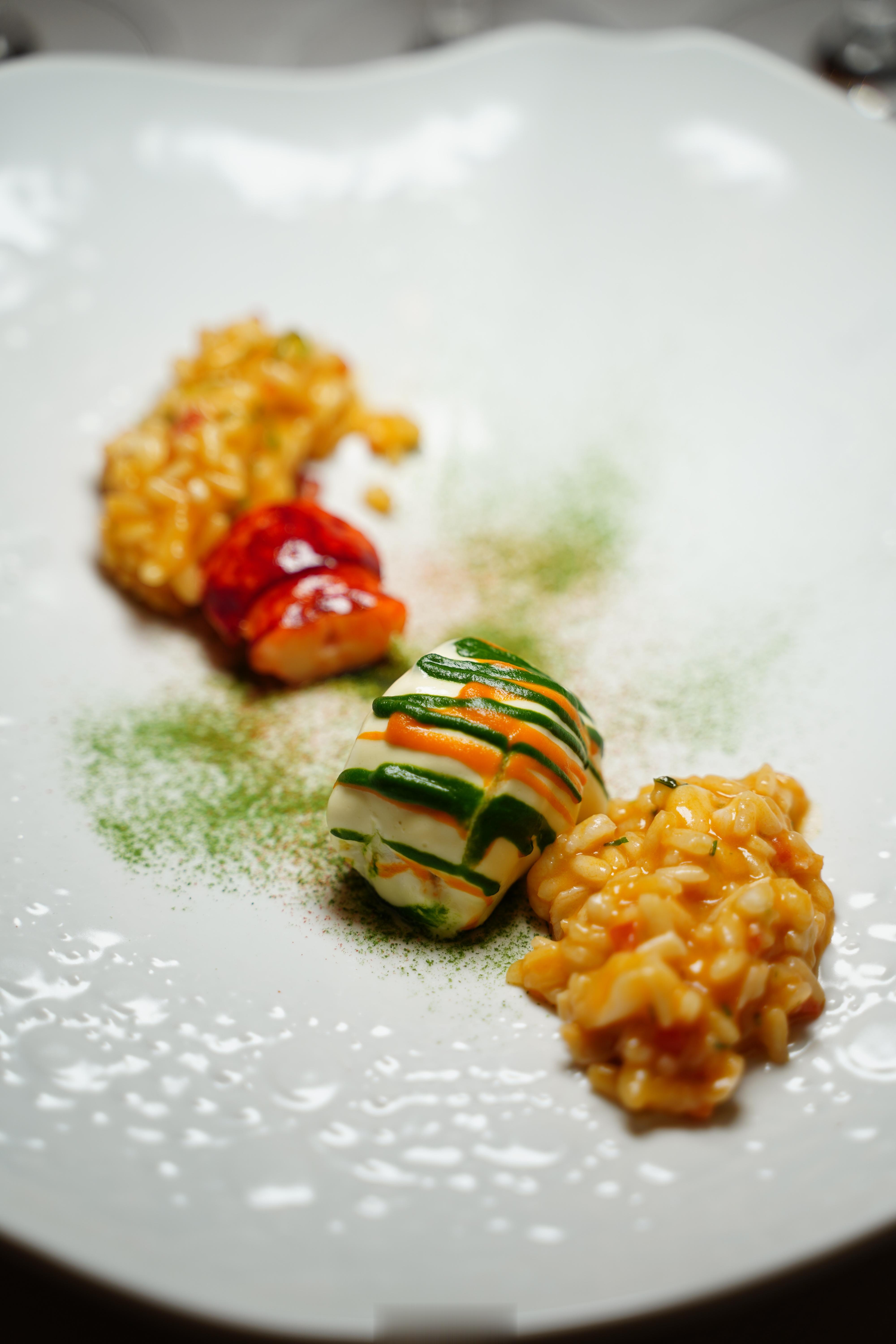 🐟主菜取鮟鱇鱼身最嫩的部位烹制,这款源自葡萄牙家庭传统料理的再次创新,黄色酱以鮟鱇鱼头加橄榄油熬制,鱼肉弹嫩酱味丰腴。龙虾烩饭