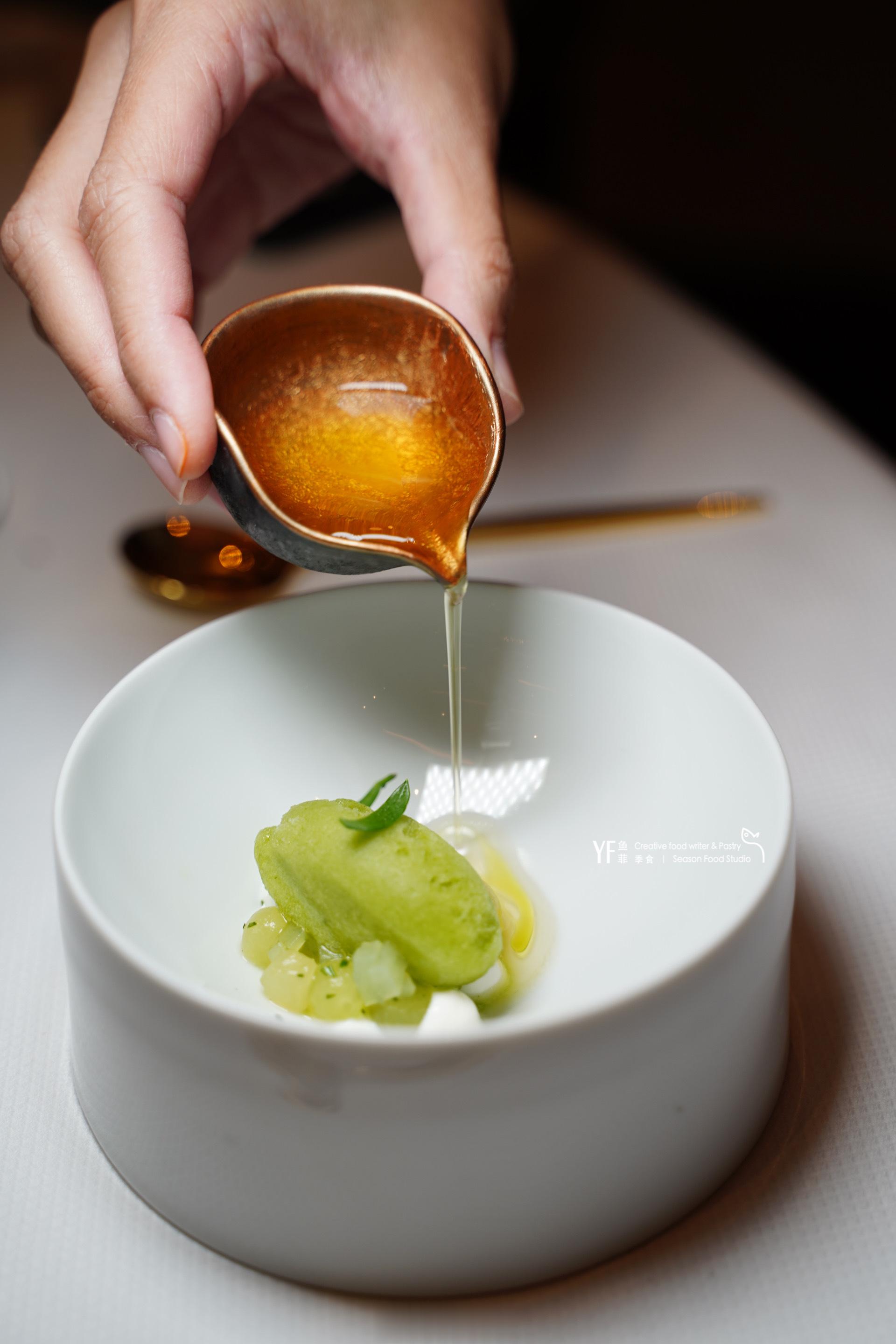 🍊还有一款收口的里斯本甜酒,初嗅透着一丝海洋矿物质的气息,同样的高酸度。搭配以柚子泡沫和雪芭巧构的甜品,浓烈的柑橘清芬,纷繁的果酸层层递进,揉捻的开心果碎酥脆醇香,在舌尖肆意跳跃。光盘后碟底一跃而出绽放的蓝色点射饰面,亦与湛蓝的深海飨宴更唱迭和