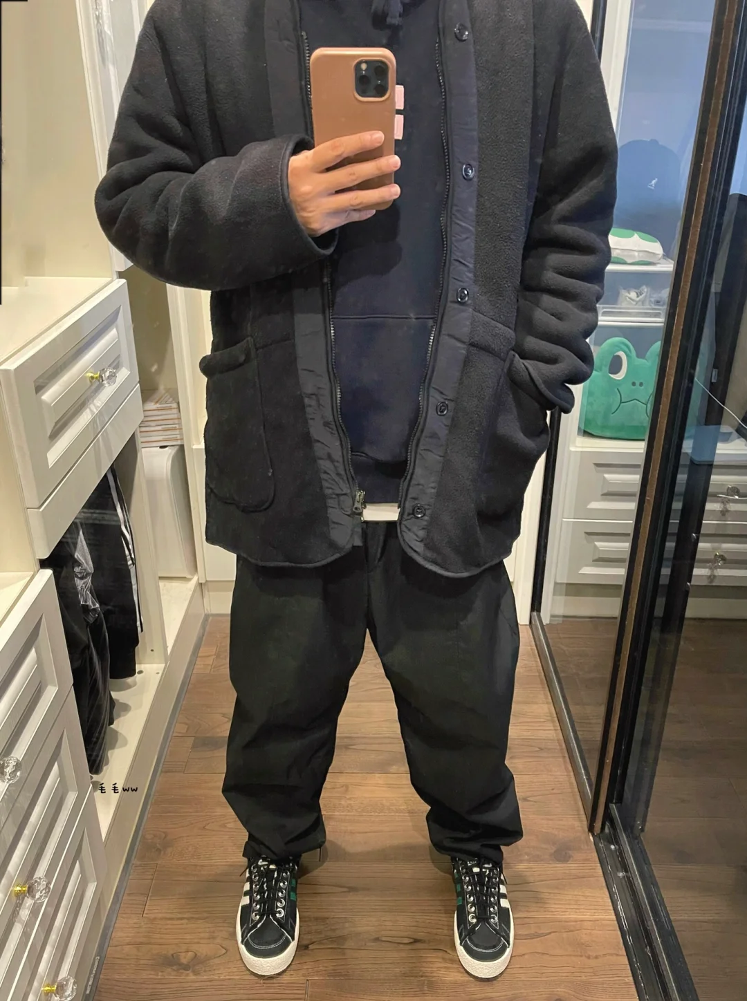 -Engineered Garments,今年U家的合作刚结束,又把19款的EG捞出来了,搭配阔腿裤还挺能打 . -熟悉的中长款,宽松廓形;同为摇粒绒,不同的是材质反转,外侧羊羔绒更舒适,内侧长绒更保暖 . —————— . ✏️本人178cm75kg 球鞋尺码265mm(正常EU42) . 💭以上均为我个人观点,不喜勿喷,欢迎讨论。