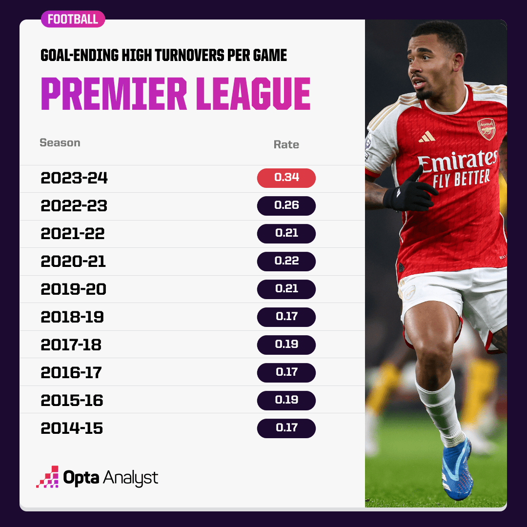 追求控球率是大趋势,英格兰的低级别联赛也是如此。后场出球体系的流行不可避免的导致更多的失误,本赛季英超球队场均在最后40米区域(以球门为中心)丢失球权16.5次,23/24赛季是10/11赛季有记录以来的最高的一个赛季。