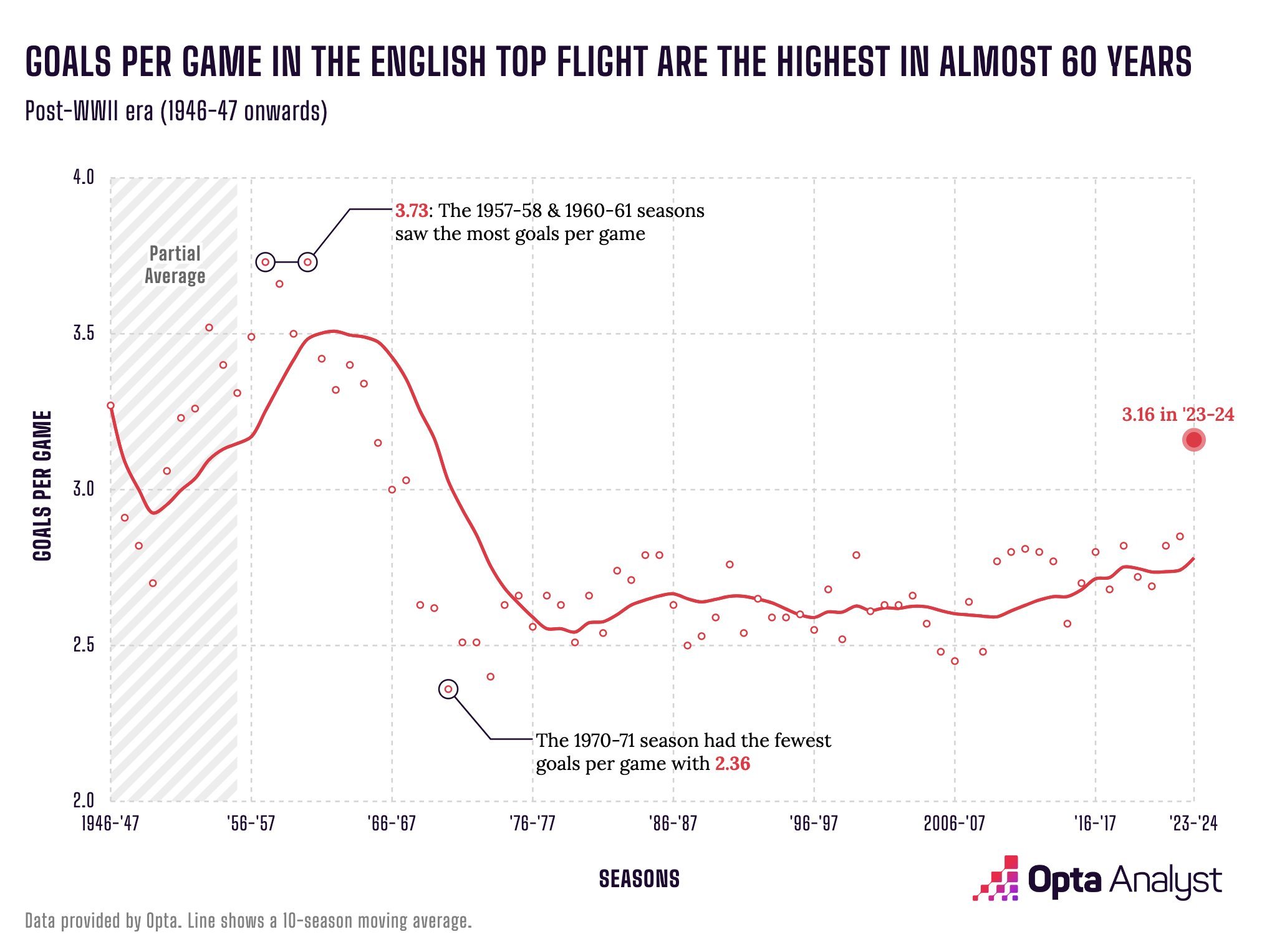 本赛季英超单场进球数(3.16)是1964/65赛季以来英格兰顶级联赛的最高记录,其它级别联赛也出现了类似情况。(图一)