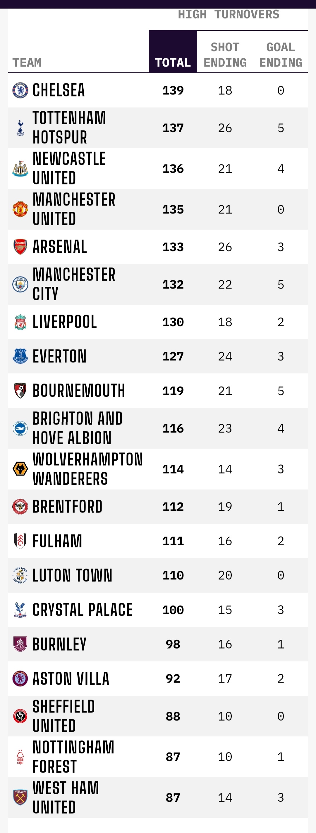 切尔西是高位逼抢力度最大的球队,致使对方在最后40米区域丢失球权139次,不过他们的收益却是最少的(导致0进球)。(图四)