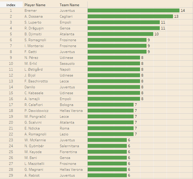本赛季五大联赛在本方禁区里赢得争顶次数最多的球员,尤文图斯不只中卫,连中场球员都能进榜。