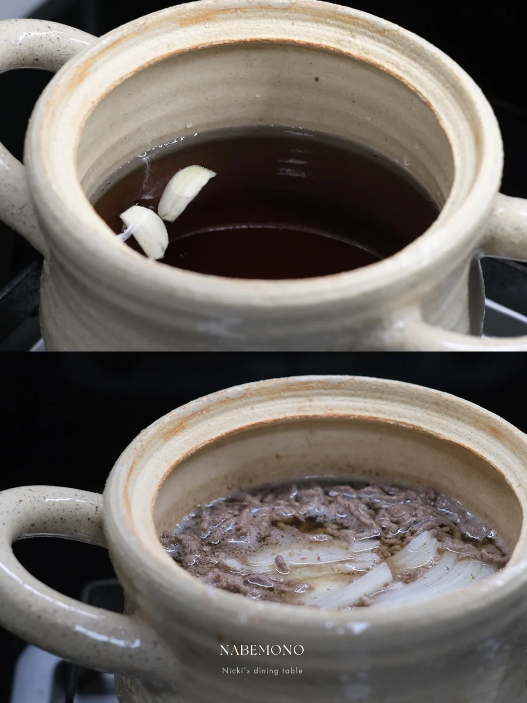 •锅中盛水,加2大勺清酒、1大勺生抽、2-3瓣大蒜煮开后放入肉沫。